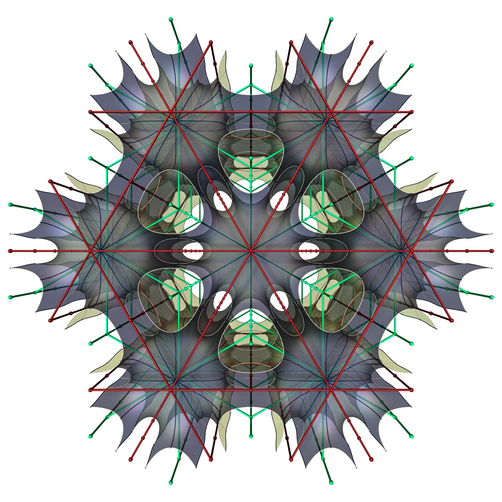If we remove from the skeleton of the prism the edges that intersect the surface, we obtain the two skeletal graphs of the surface, shown below in extreme wide angle perspective from above. That one of the graph has triangle layers and the other rhombic layers is the reason for Schoen’s naming convention: The letters T and R stand for triangle and rhombus.