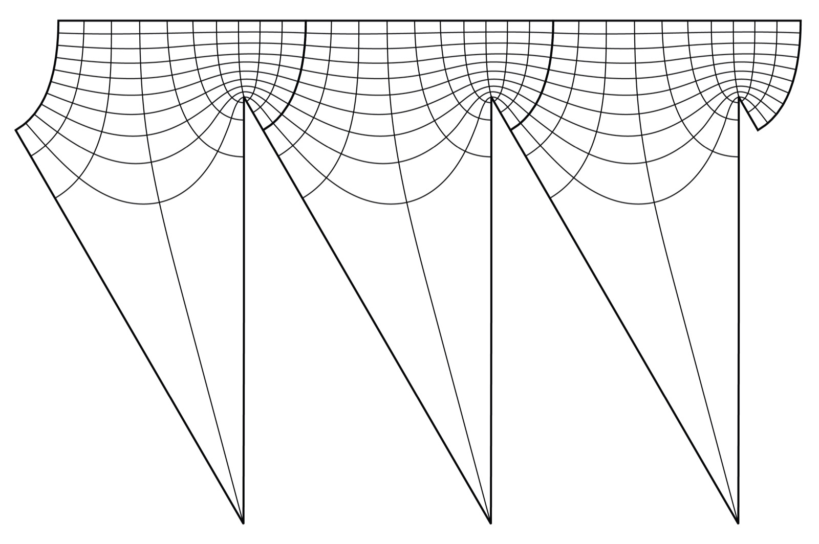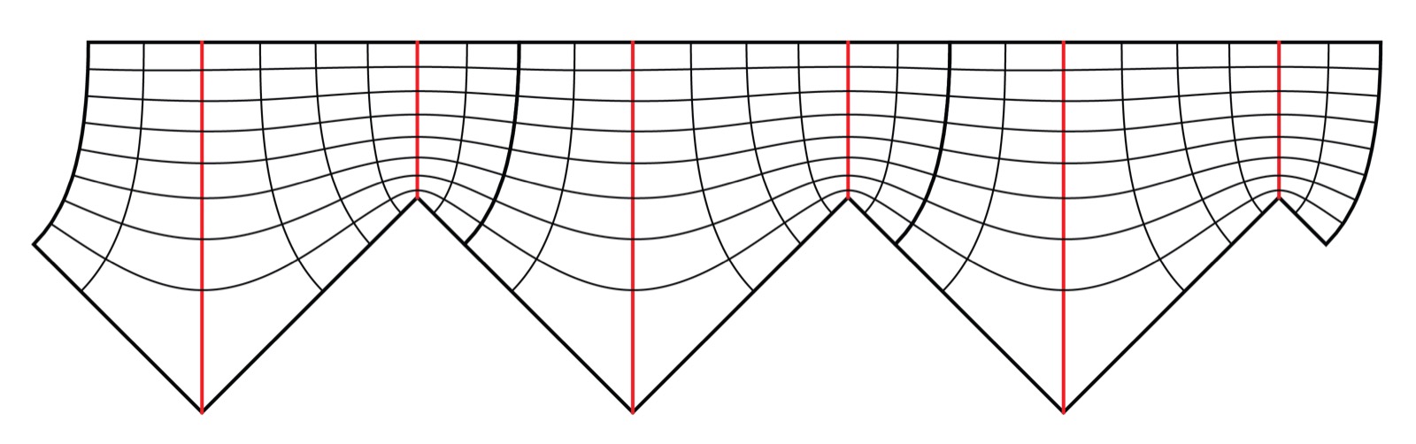 The piece in a prism can also be used to effectively parametrize these surfaces. To do this, note that the vertical faces of the prism meet the surfaces in two arcs: One is a segment without corners, the other has two 30º corners where the arc switches from one face of the prism to another. These corners are also the only points with vertical normal. We can therefore conformally parametrize a surface piece in a prism by the shaded rectangle below.