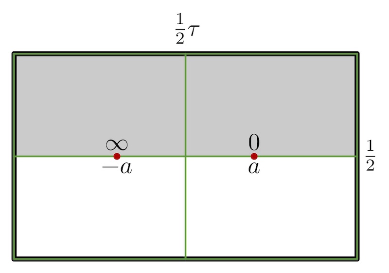 The vertical edges correspond to horizontal symmetry lines, and the horizontal edges to symmetry lines in the vertical prism faces. In this way, the shaded rectangle corresponds to the flat structure of the height differential. The points marked a and -a correspond to the two corners, where the Gauss map as a pole and zero, respectively. The value of a for an (r,s,t)-prism is determined (a consequence of Abel’s theorem) as.