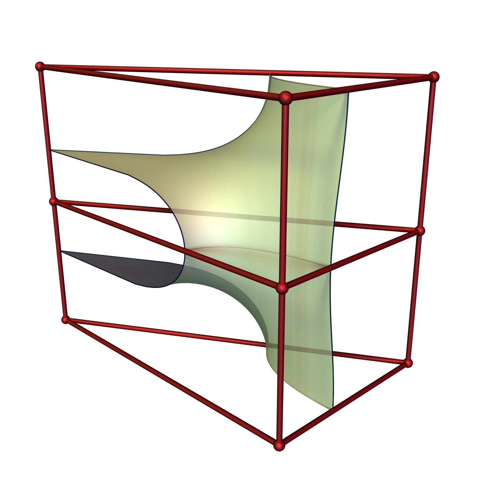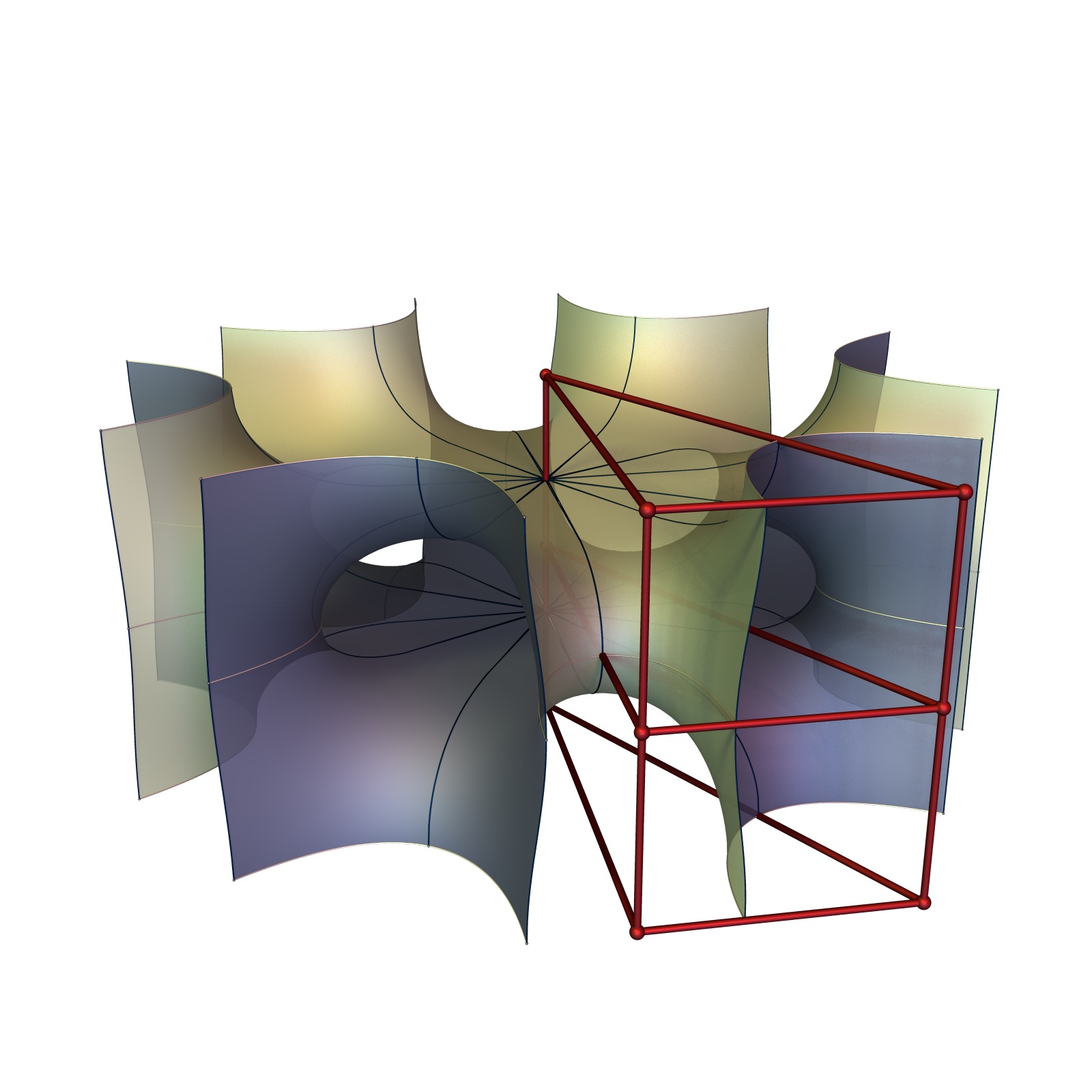The red lines correspond the the horizontal straight lines on the P-surface. We will see in a later post that the same method can be used to generate many more surfaces.