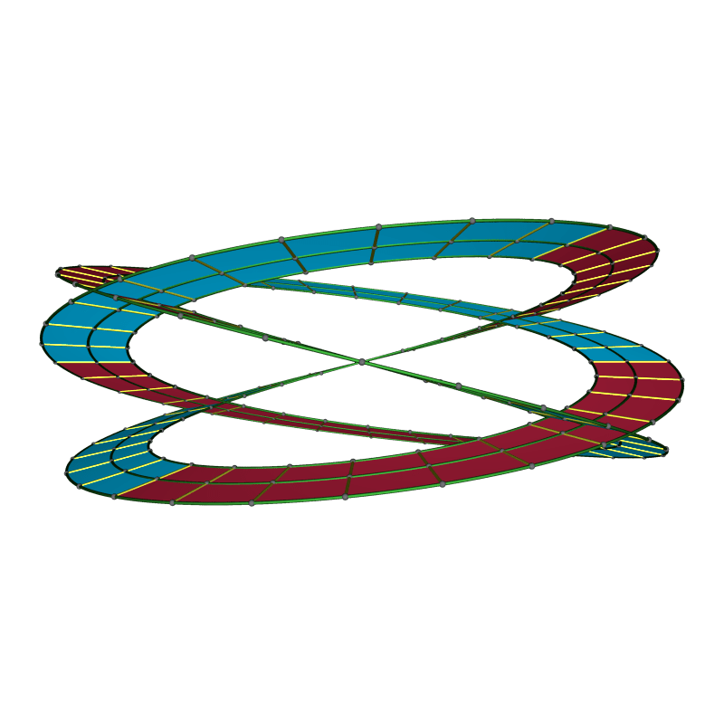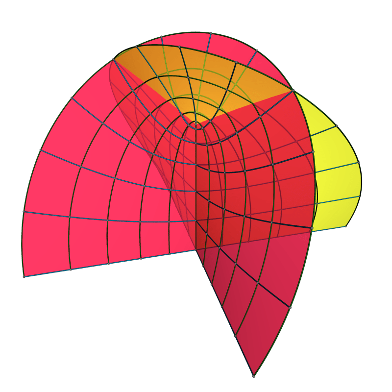 To better understand the surface, we assemble it from pieces bounded by symmetry lines. Below is the top half, containing one of the crosscut singularities and half of the vertical segments as well as the pair at horizontal lines in the plane .