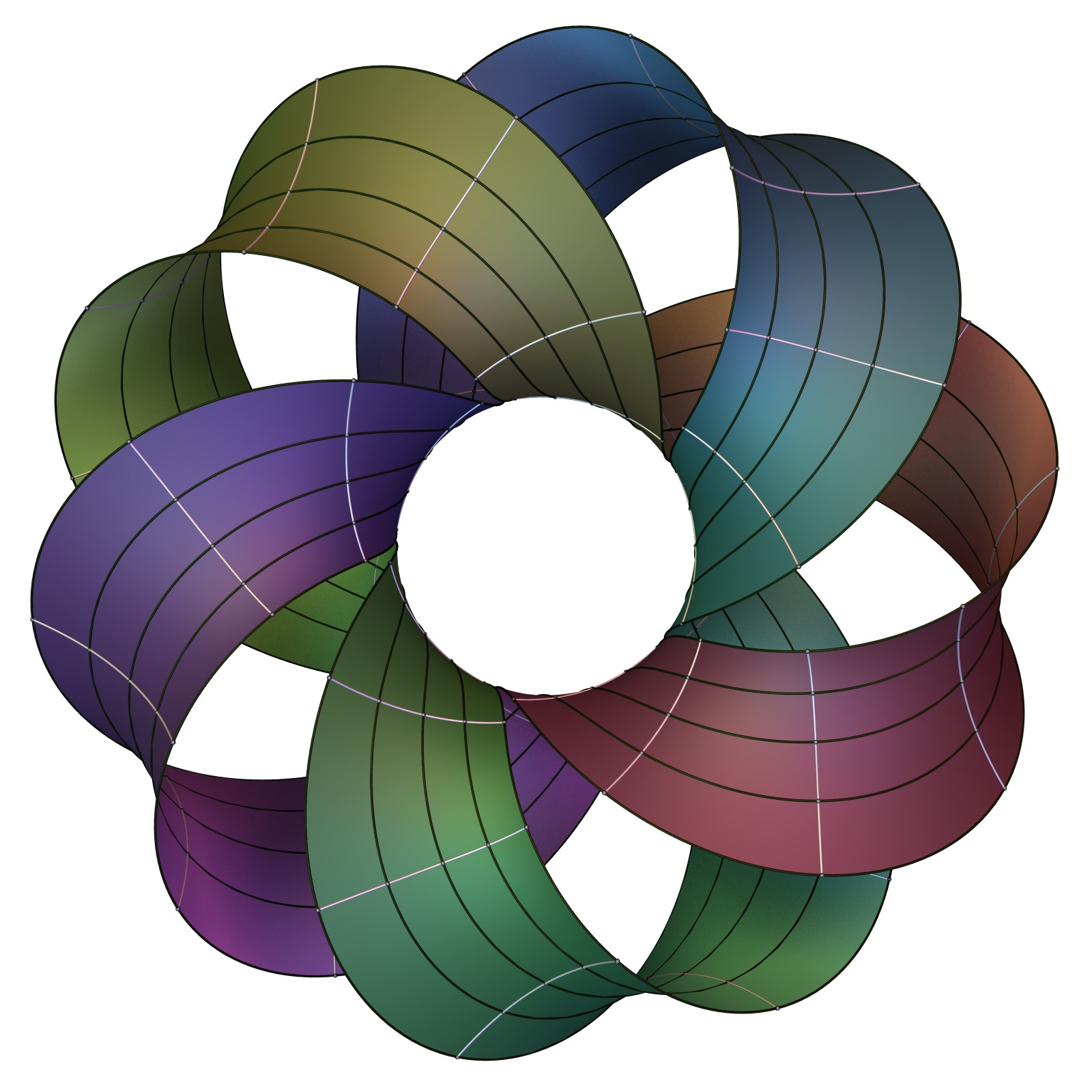 Above is a torus cut open along a (2,5) knot, and to the right the Björling surface one gets from it, using as a normal the surface normal to the torus. Below are (2,3) and (3,5) knots, obtained the same way.