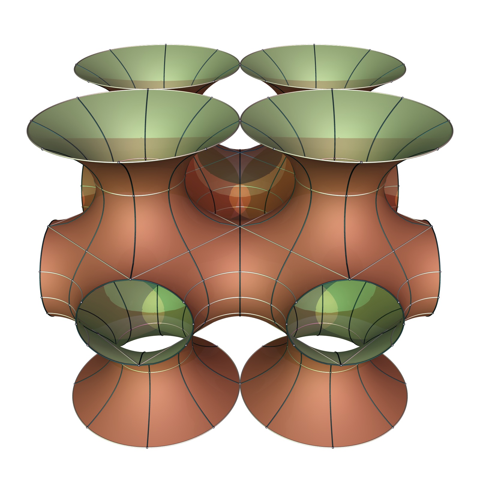 The surfaces here are doubly periodic variations of the translation invariant catenoid (aka the fence of catenoids).