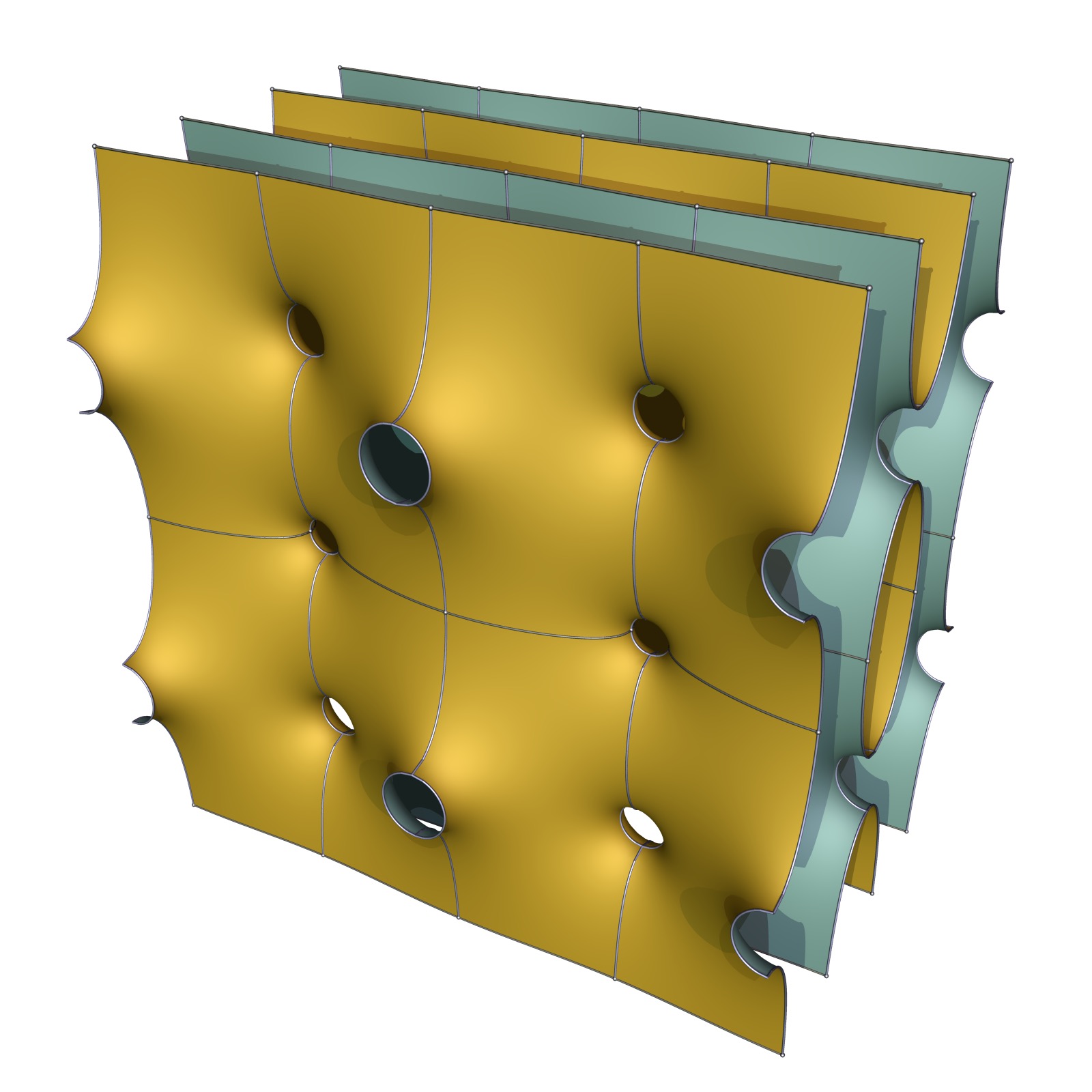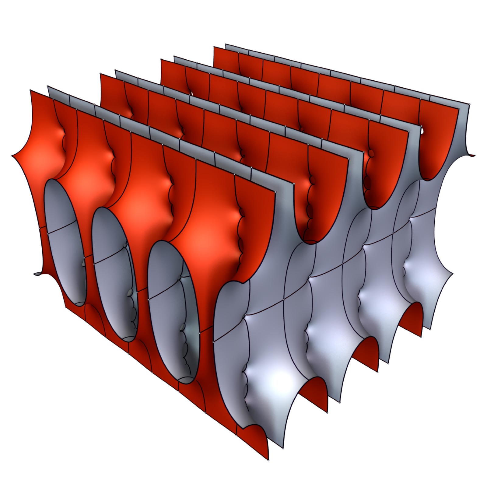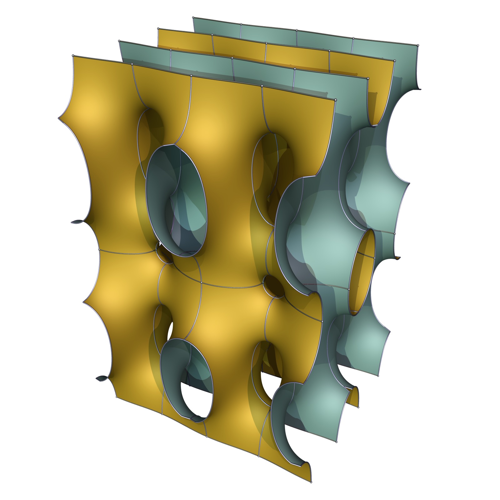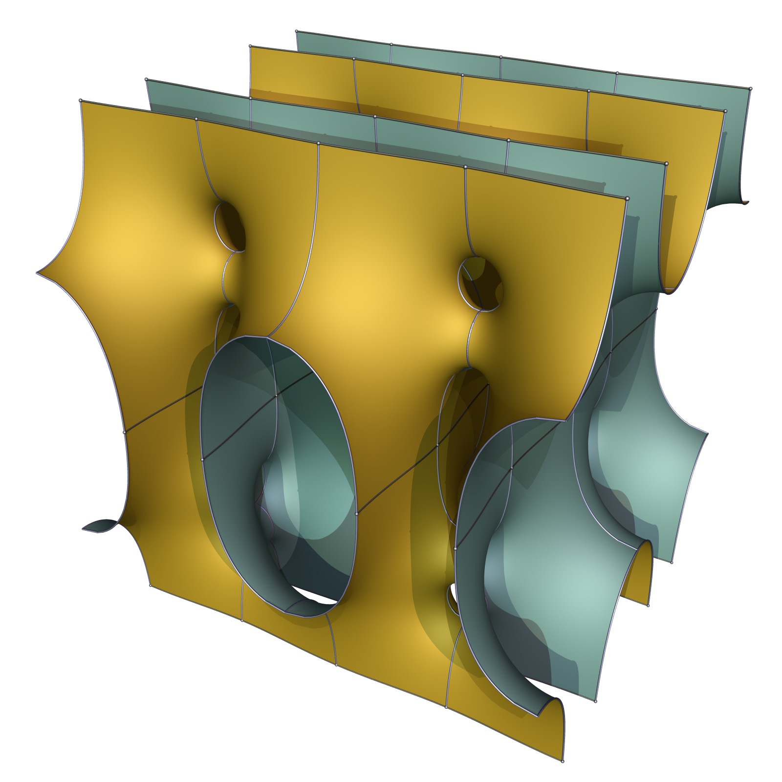 Above surface is of type (1,3), meaning 1 catenoidal neck pointing towards and 3 away from you in a translational fundamental piece. This description is suitable to construct the surfaces using their nodal limit and Traizet’s regeneration method, as carried out by Peter Connor and Matthias Weber. This construction produces 3-dimensional families of surfaces.