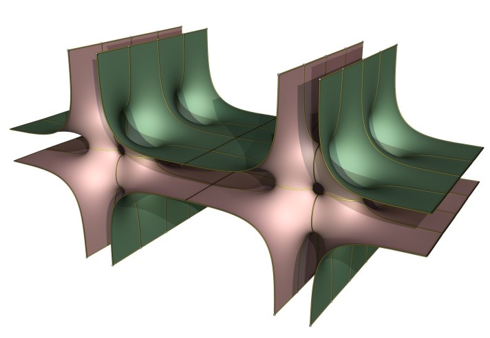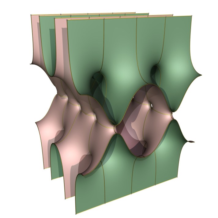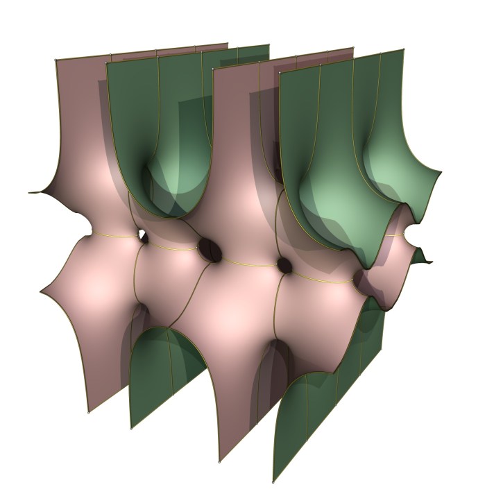 The other limit is more complicated. It appears that two doubly periodic Scherk surfaces with one tilted end each have been glued together end-to-end, with the intersections resolved by singly periodic Scherk surfaces: