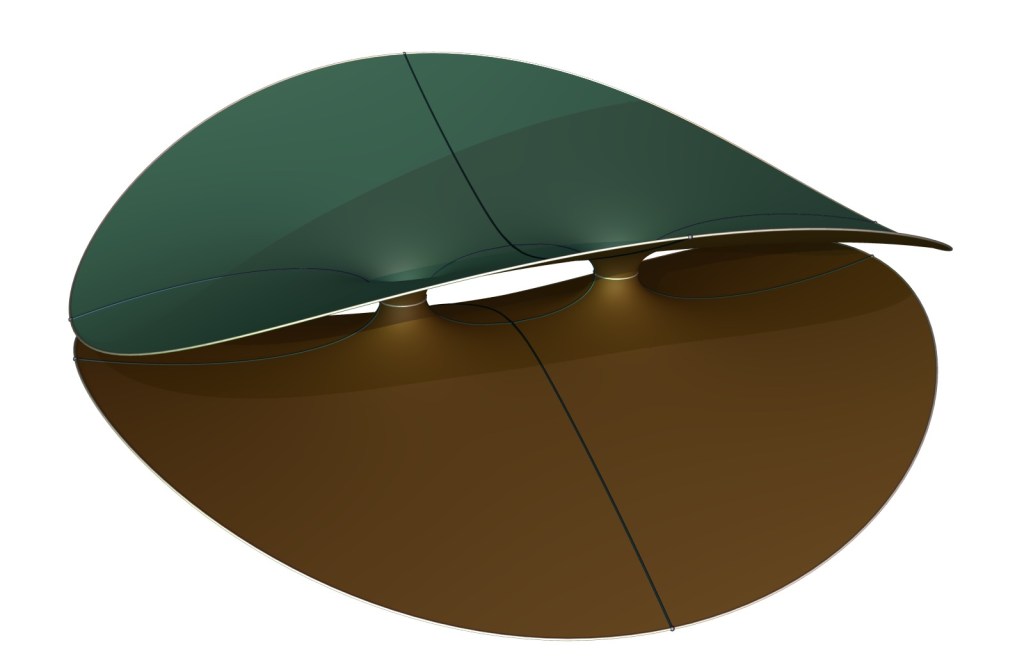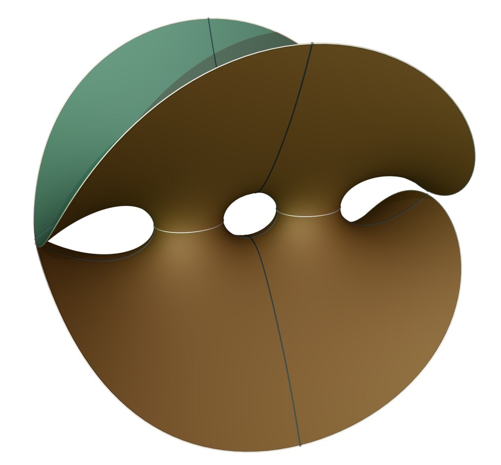 Versions with higher dihedral symmetry exist, too. I wonder what happens to the handle when one rotates the two Enneper ends as in the twisted version of the Double Enneper surface. In particular, can one achieve a full 360º twist?