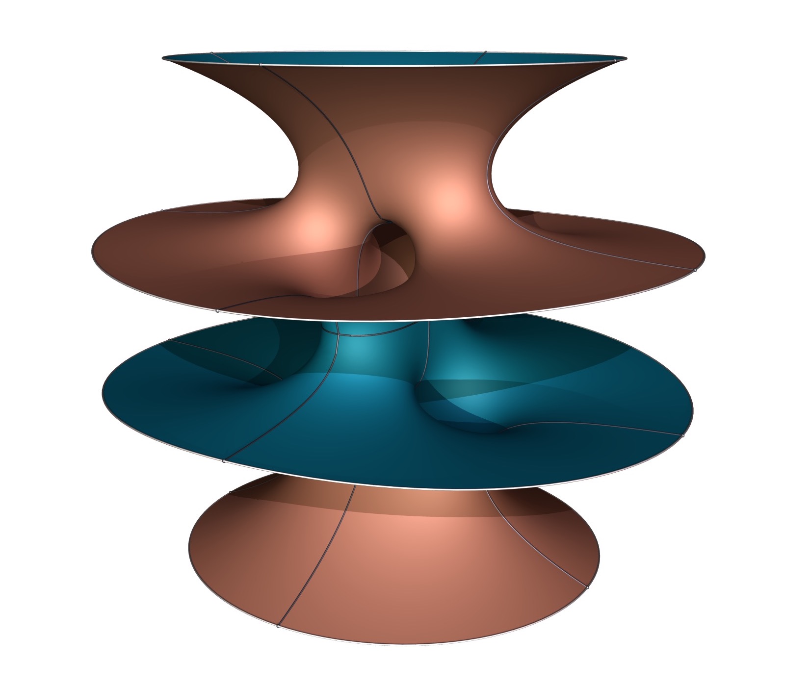 In his dissertation from 1993, Meinhard Wohlgemuth constructs the a 4-ended embedded minimal surface of genus 2, which he calls CSSCFF. This was the first complete embedded minimal surface with four ends, generalizing Costa’s surface.