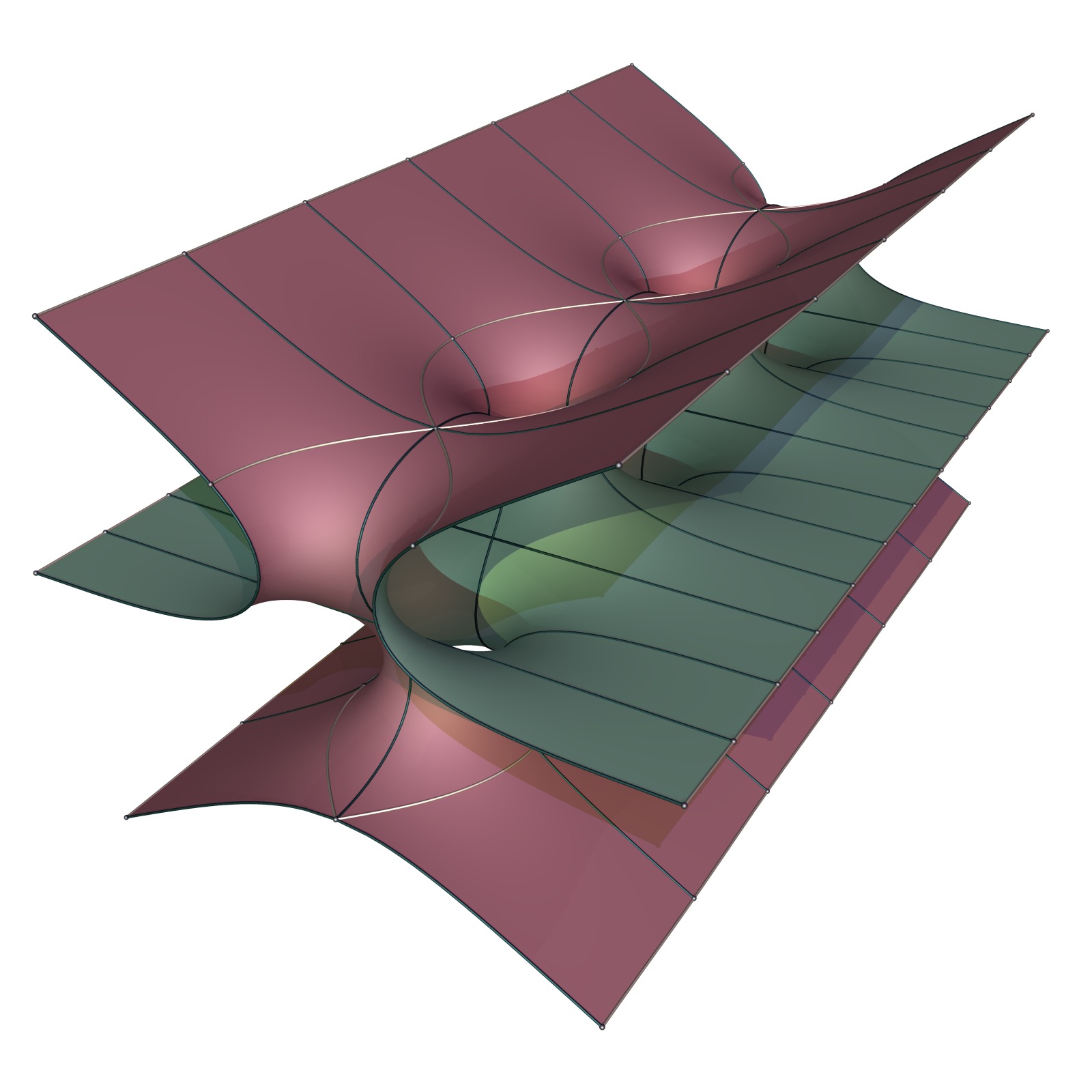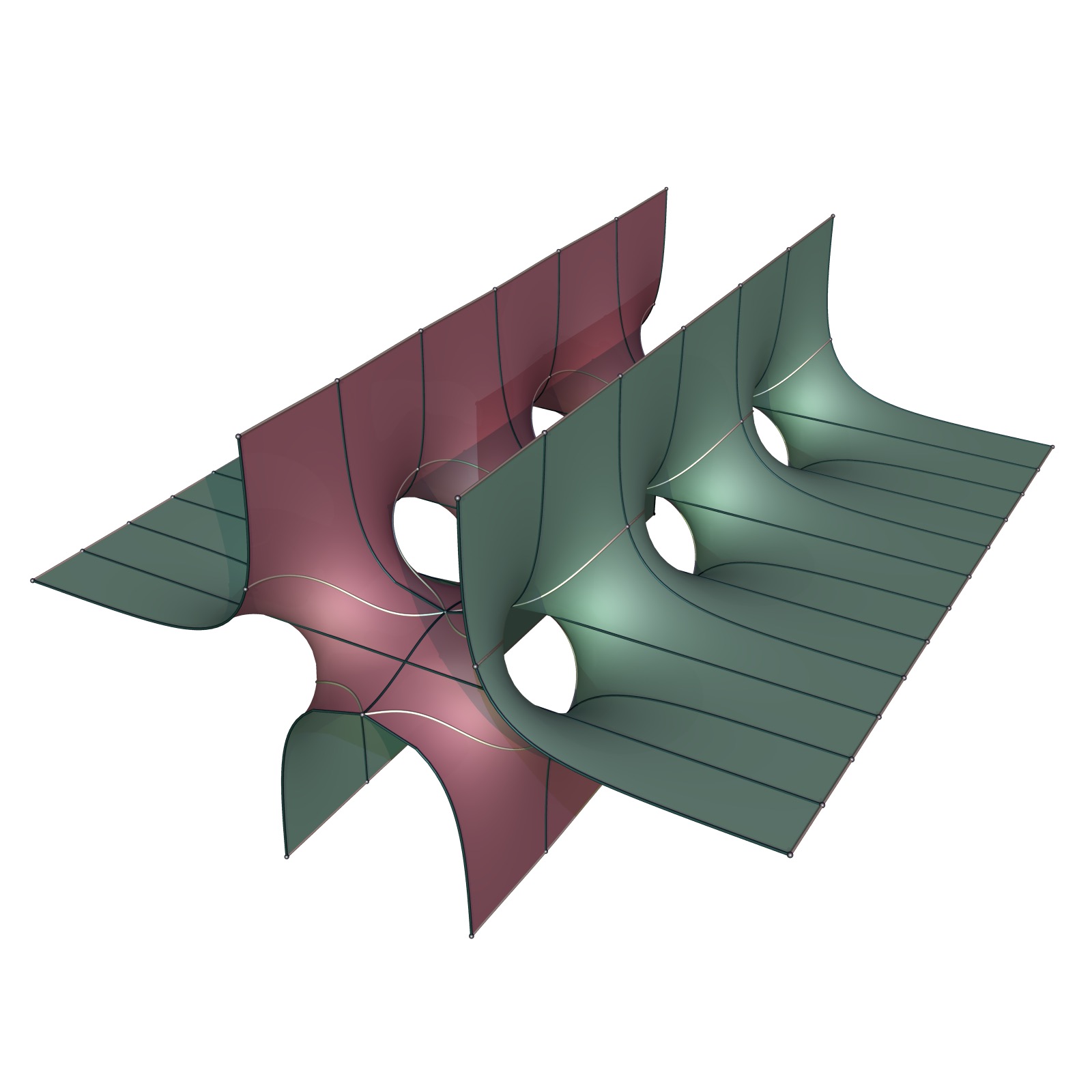 Above are embedded examples that have two horizontal annular ends, while the remaining ends make an angle of 30º and 89º degrees with the horizontal plane. They also have the vertical coordinate planes as symmetry planes. When the angles approaches 0, we get a simple noded limit. Increasing the angle to 90º and higher creates non-embedded surfaces with another symmetry type.