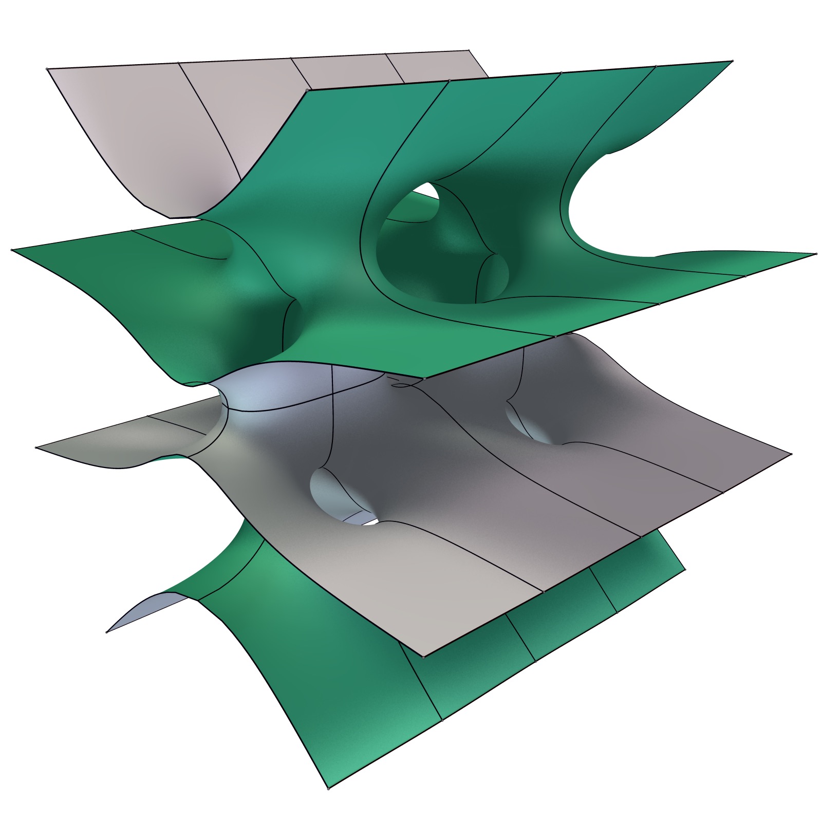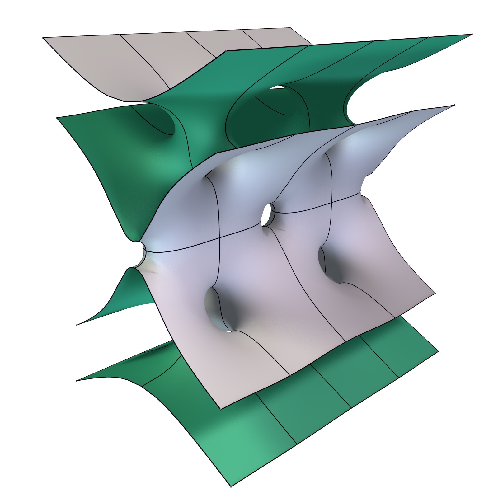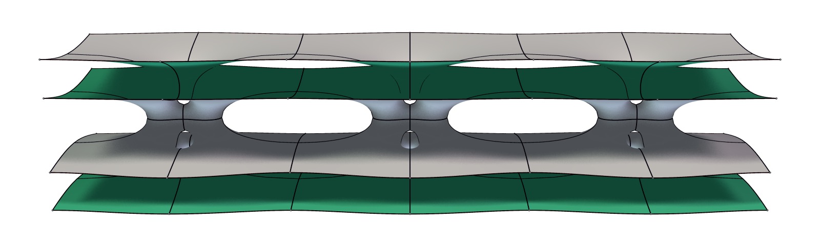 This translation invariant surface was discovered in 2009 by Márcio Fabio da Silva and Valério Ramos Batista. It features 8 annular ends and has genus 2.