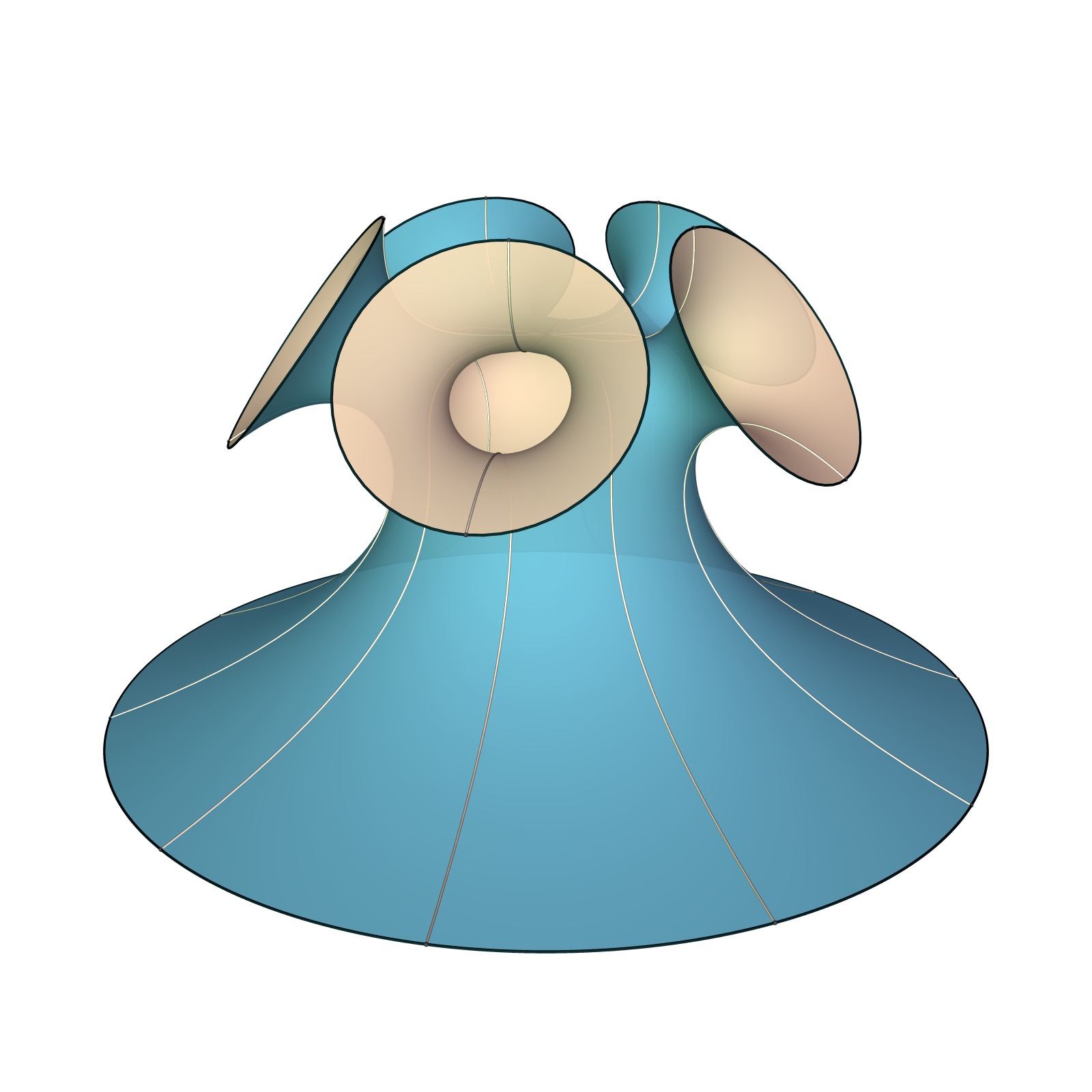 Symmetric placement of the points helps, like here at the vertices of a pyramid over a regular base. The image above shows that after fixing the conformal type there still is some freedom left. The right case is the most regular case, sometimes called the tetrahedroid, which also appears among the antiprismatic k-Noids.