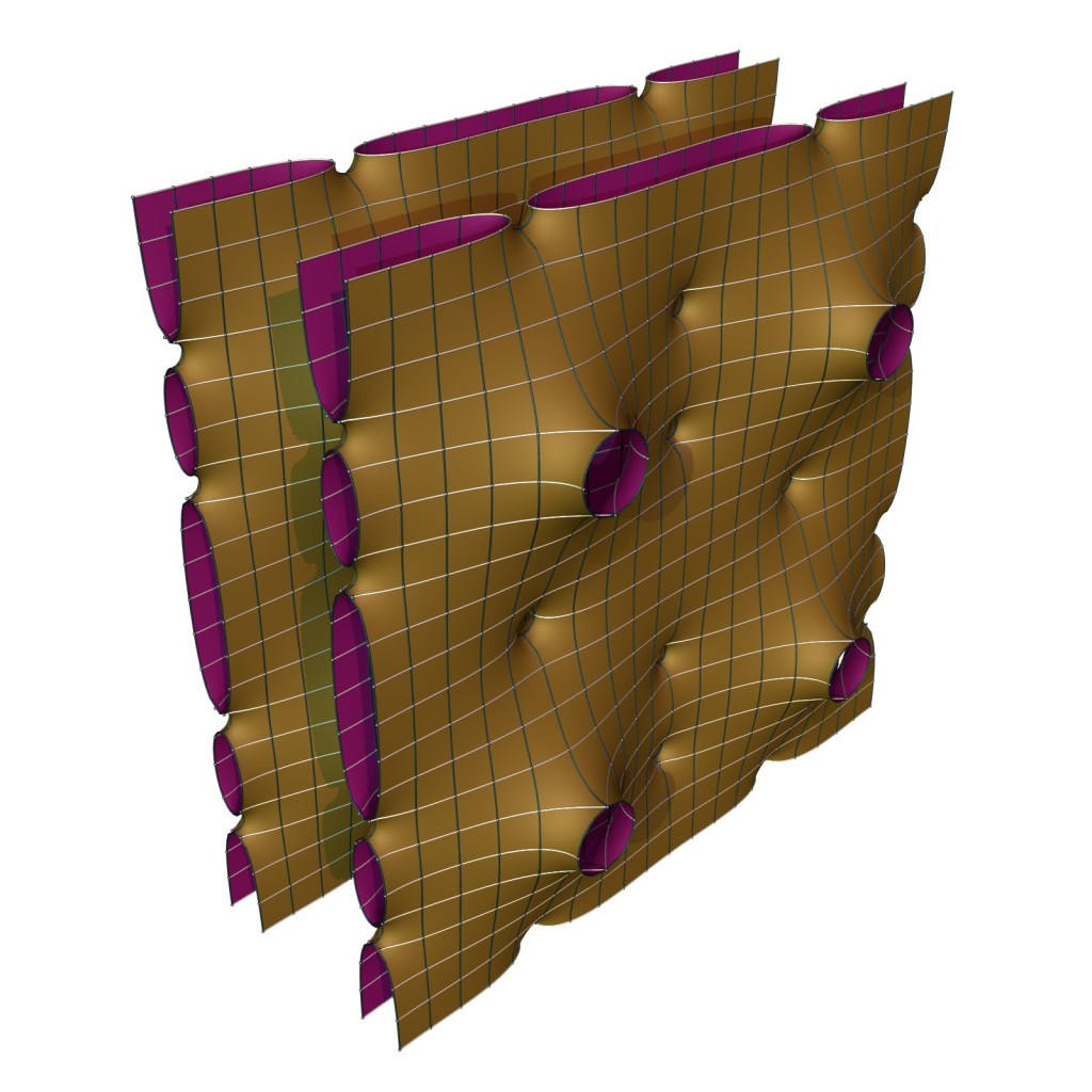 This is one of two families of genus 5 surfaces that have the same behavior along the boundary of the box: In one boundary component, the Gauss map points vertically up at two corners, while in the other component it changes between up and down.