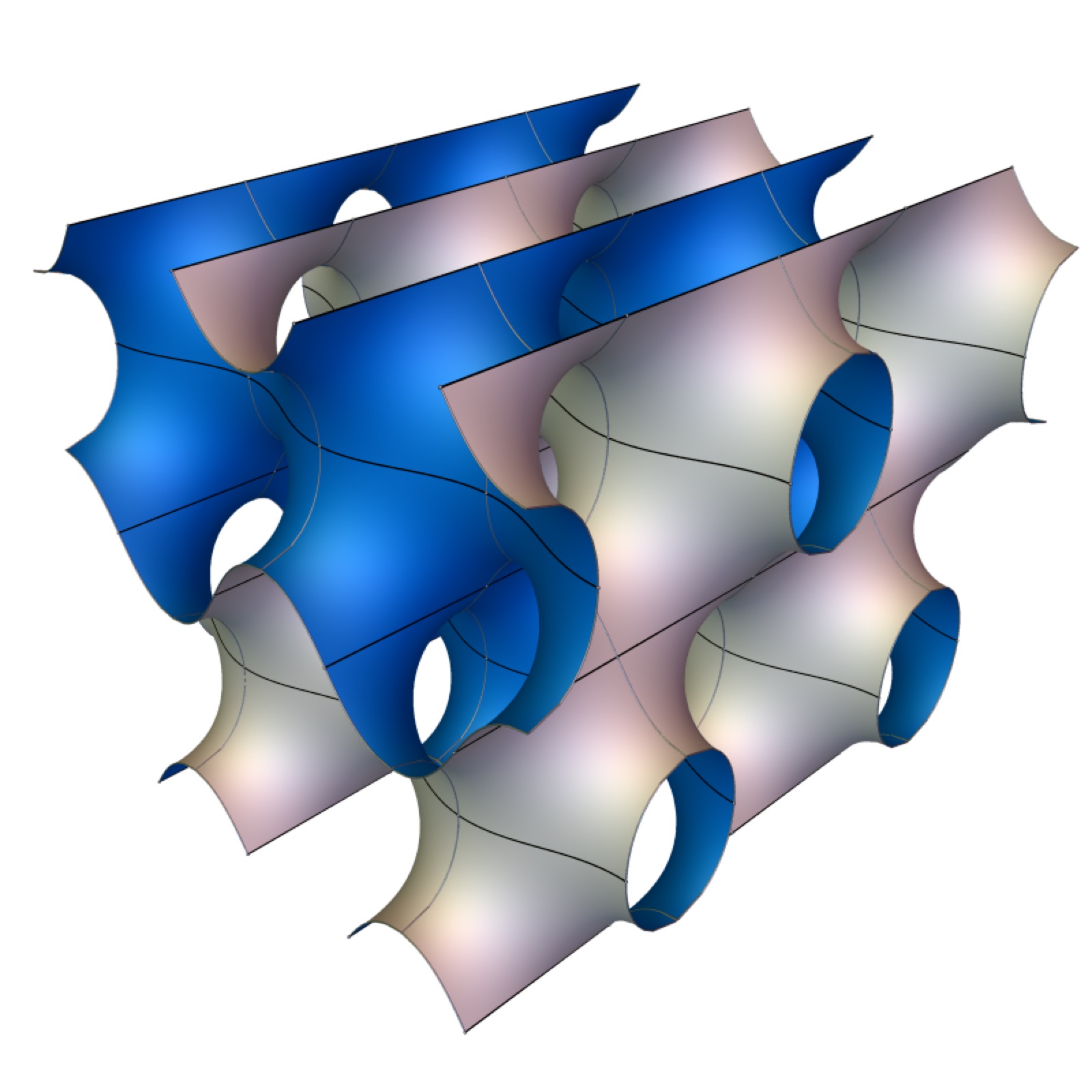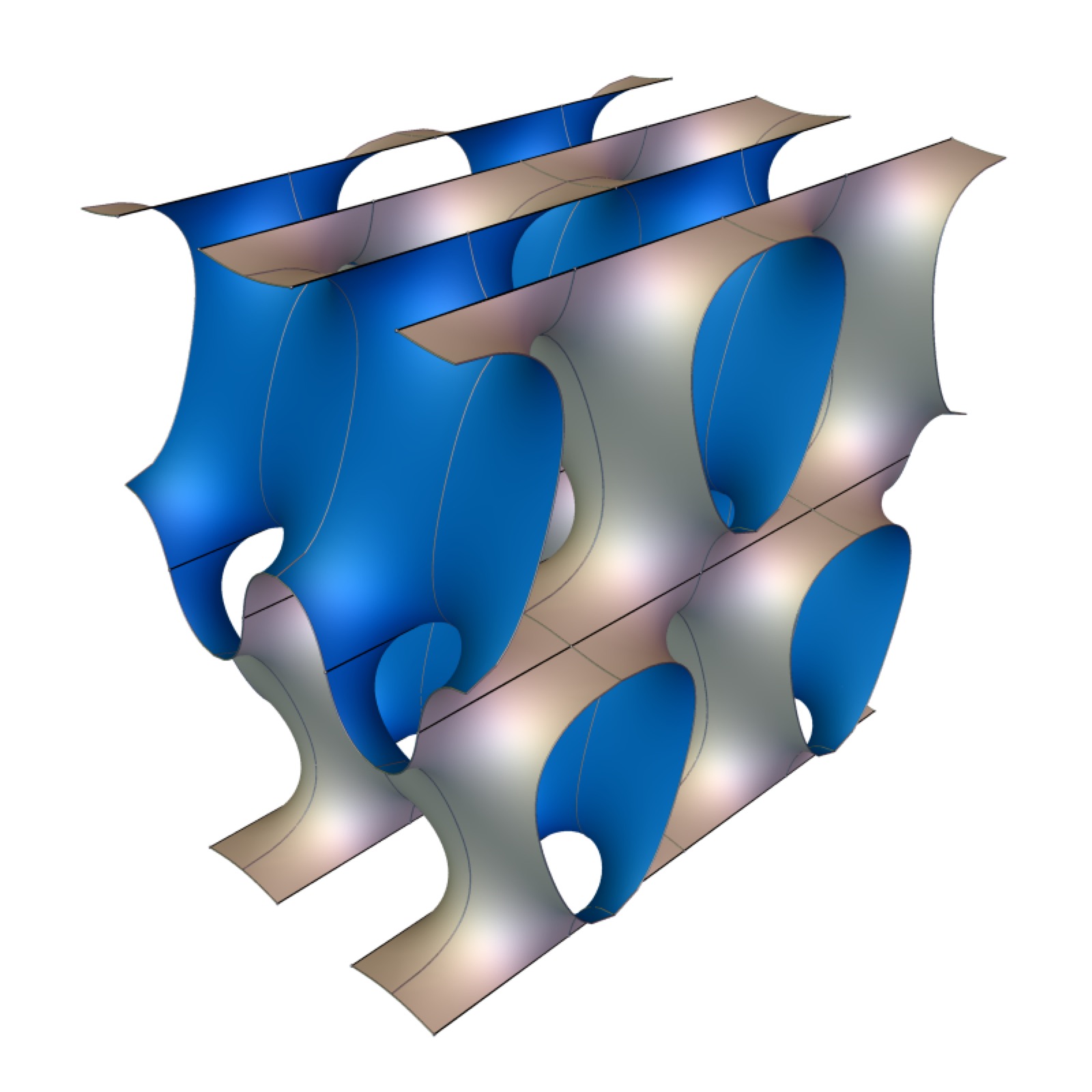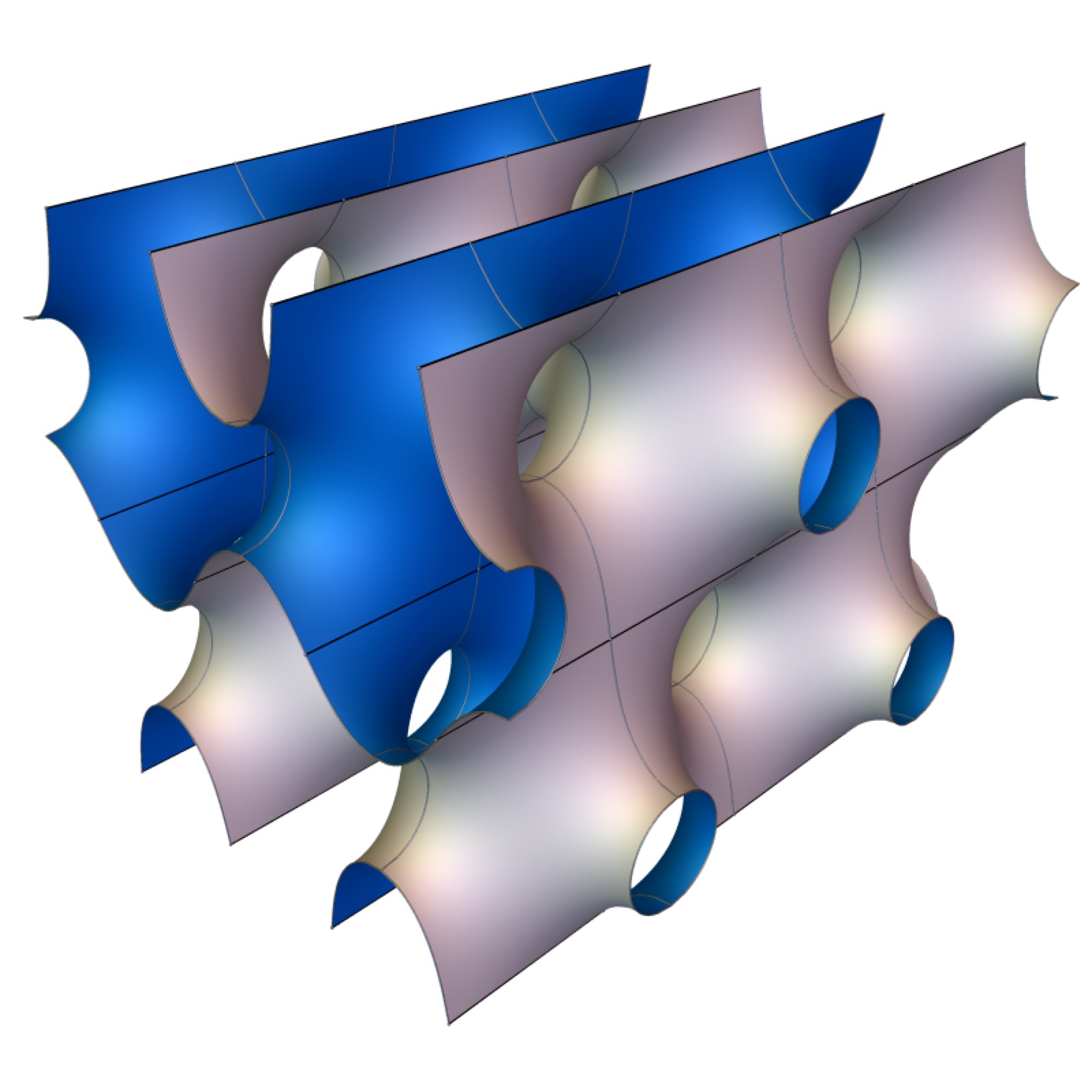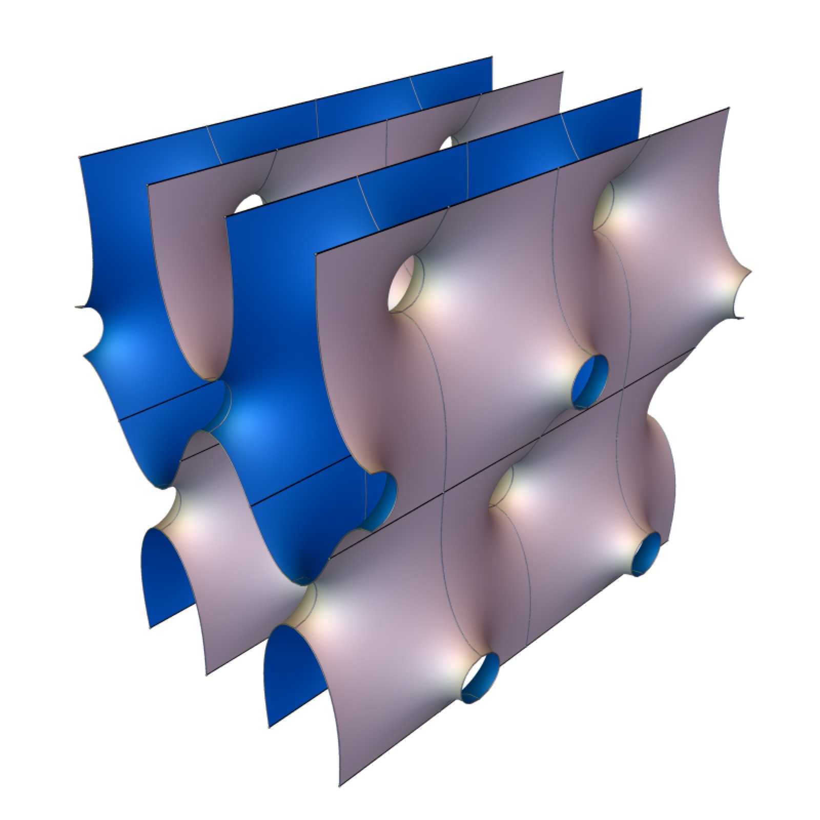 Above are two extreme cases of this new deformation. The left image arises when a and b are close: We obtain singly periodic Scherk surfaces over a rhombic pattern. The right image arises when b approaches .5, here we see doubly periodic KMR surfaces as limits.