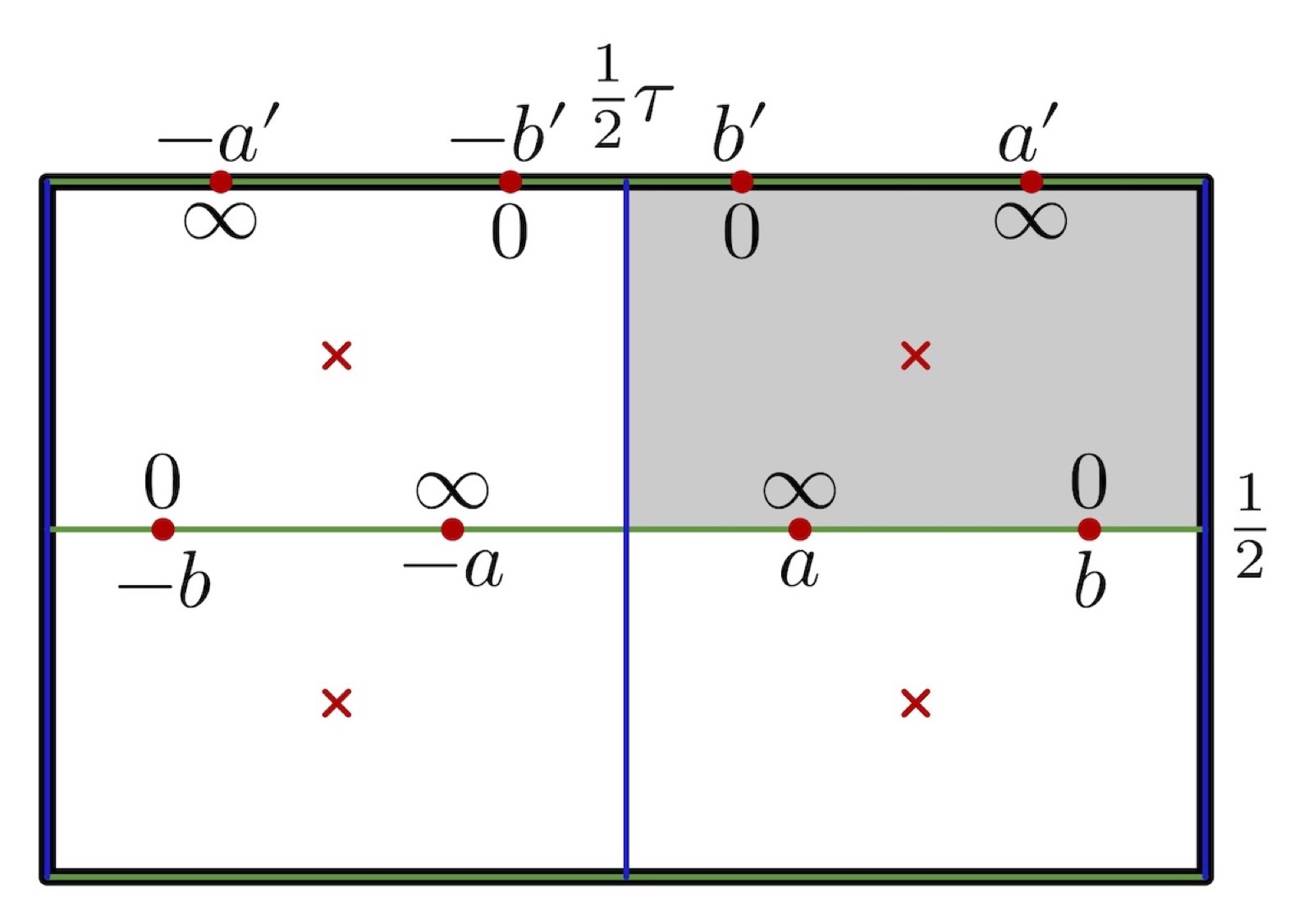 This octagon is the image of the shaded rectangle below that shows the divisor of the (squared) Gauss map. The points a, a’, b, b’ correspond to the vertices, where the Gauss map has its zeroes and poles.
