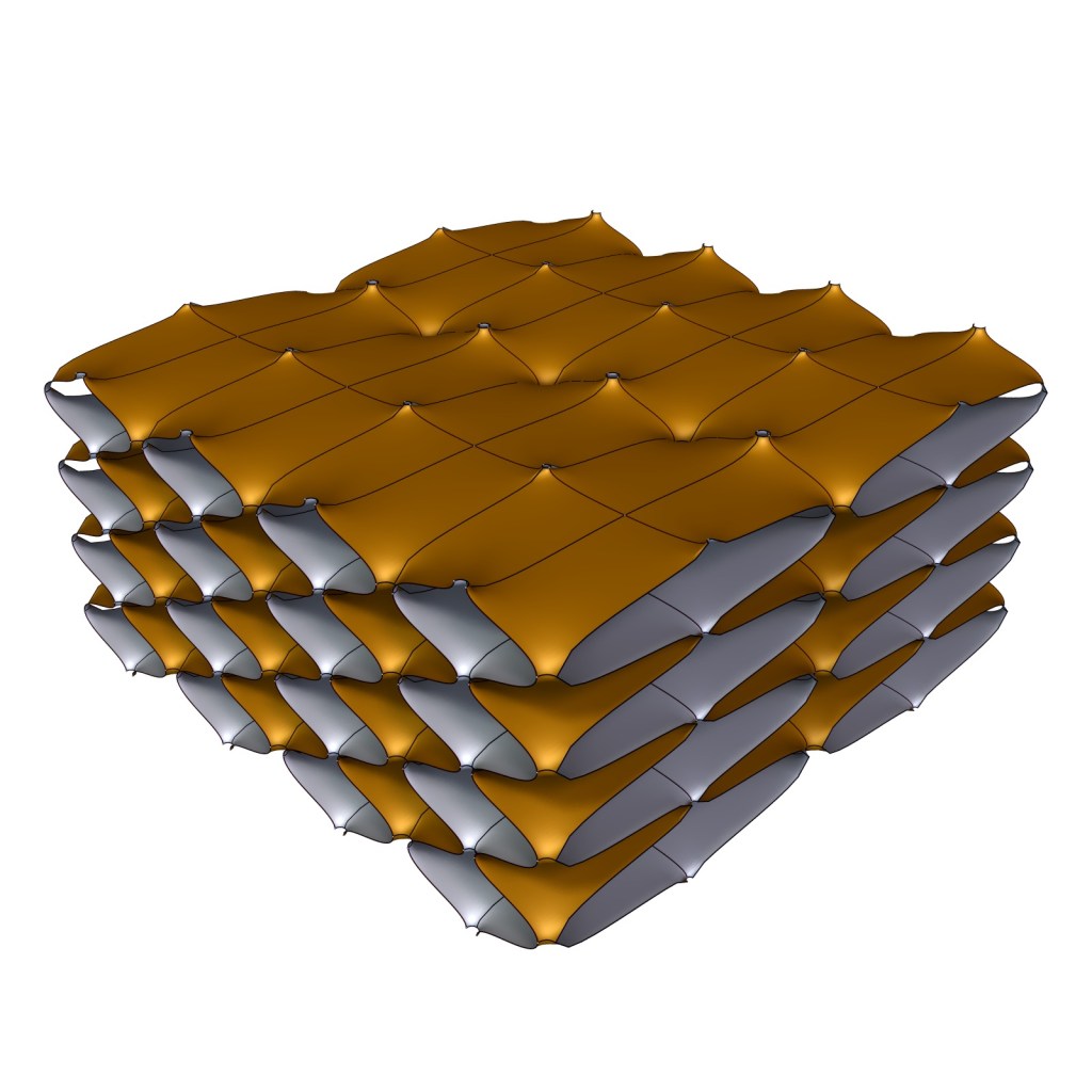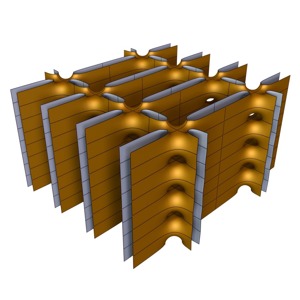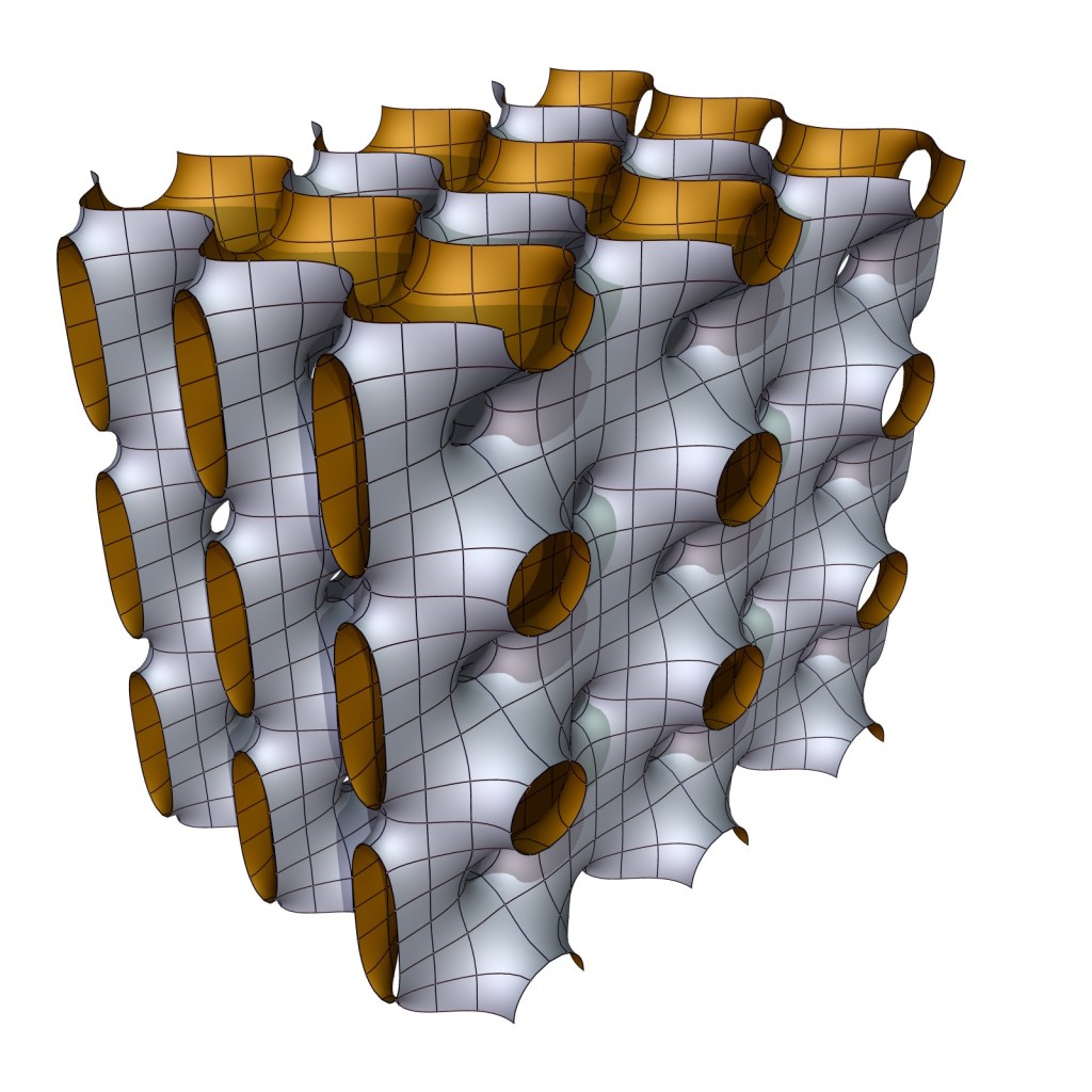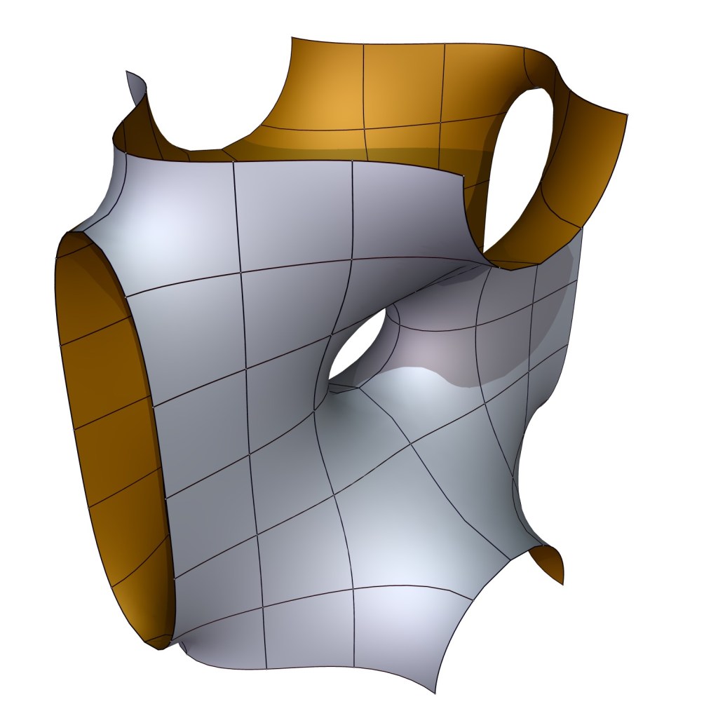 For a long time I thought of this surface as the CLP surface with an additional inward handle, as the image above suggests. Different assemblies show that it is nothing but a deformation of S’-S”. Limits include 8-ended Karcher-Scherk surfaces, Rossman-Thayer-Wohlgemuth surfaces, and nodal limits.