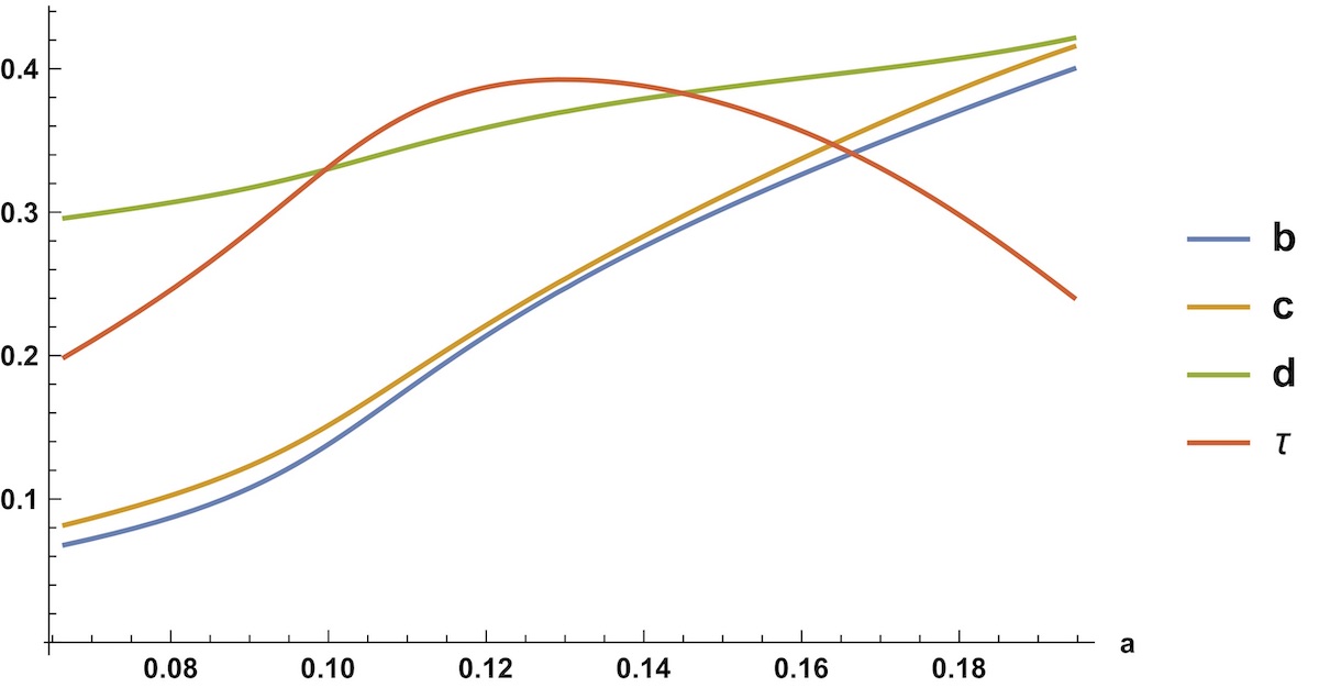The period problem becomes 3-dimensional, which is somewhat unpleasant. Besides the established symmetrical deformation, there is at least one other solution family. Below is a graph of solutions of the parameters as functions of a.