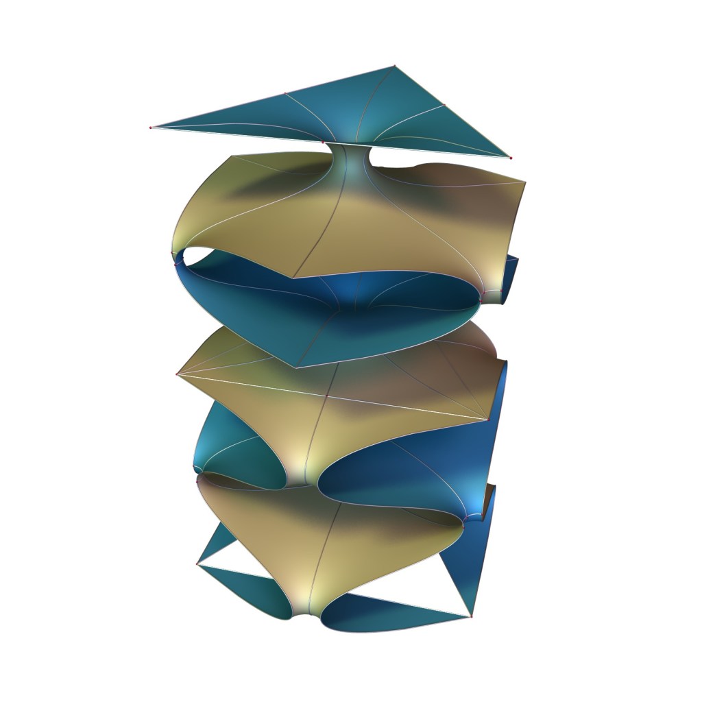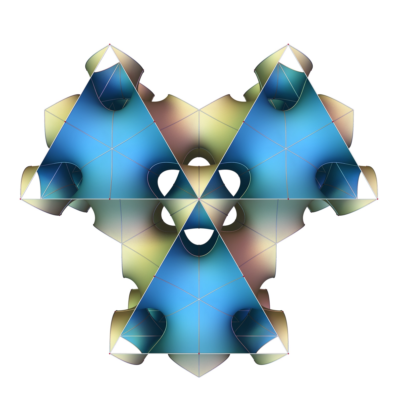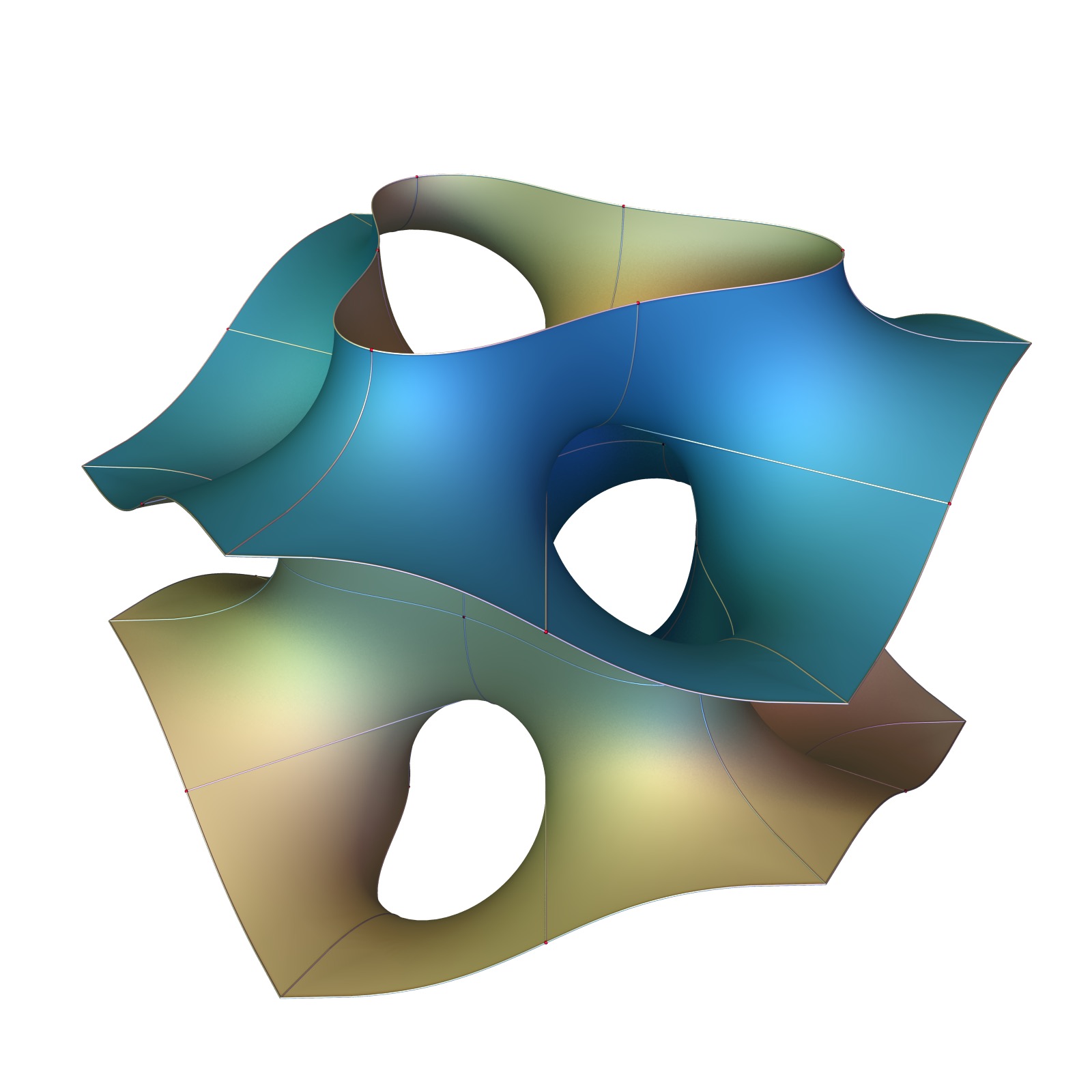 Alan Schoen’s Complementary H surfaces has the same pattern of straight lines and reflectional symmetries as the Schwarz H surface but adds a few handles, increasing the genus to 7. Below is a translational fundamental piece of a member of the 1-parameter family as shown in Schoen’s Nasa report.