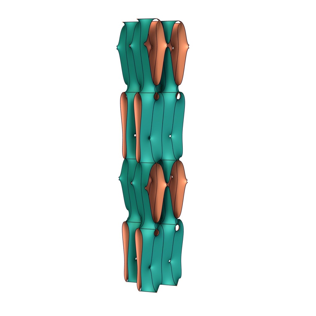 Below are 8 copies of a translational fundamental piece near the two limits: Two doubly periodic Karcher-Scherk surfaces of genus 0 and 2 on the left (with catenoidal stitches), and horizontal planes joined by Costa and Catenoidal nodes.