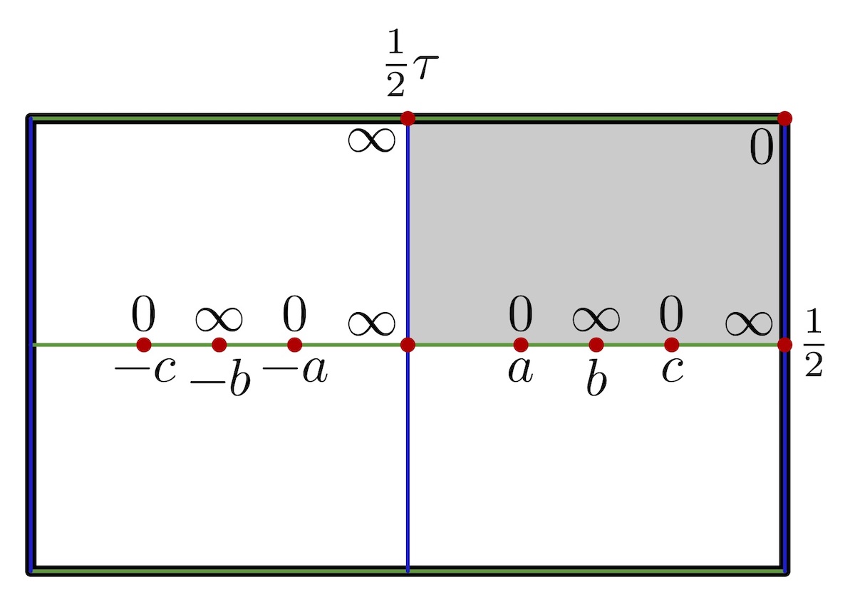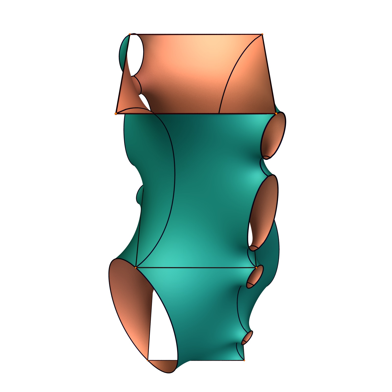 The surfaces resembles the Schwarz CLP surface with handles added. The divisor of the squared Gauss map is below.