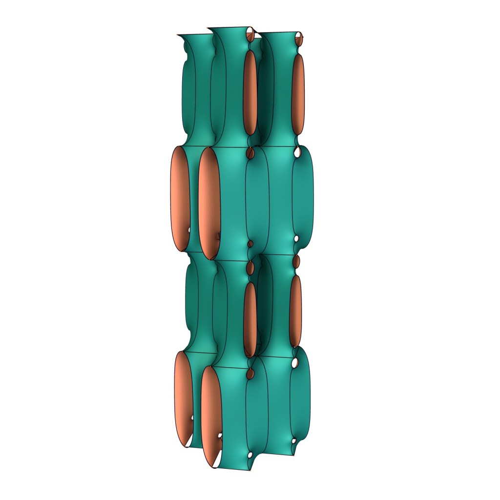 Below are 8 copies of a translational fundamental piece near the two limits: Two doubly periodic Karcher -Scherk surfaces of genus 1 and 2 on the left, and singly periodic Scherk surfaces with different frequency.