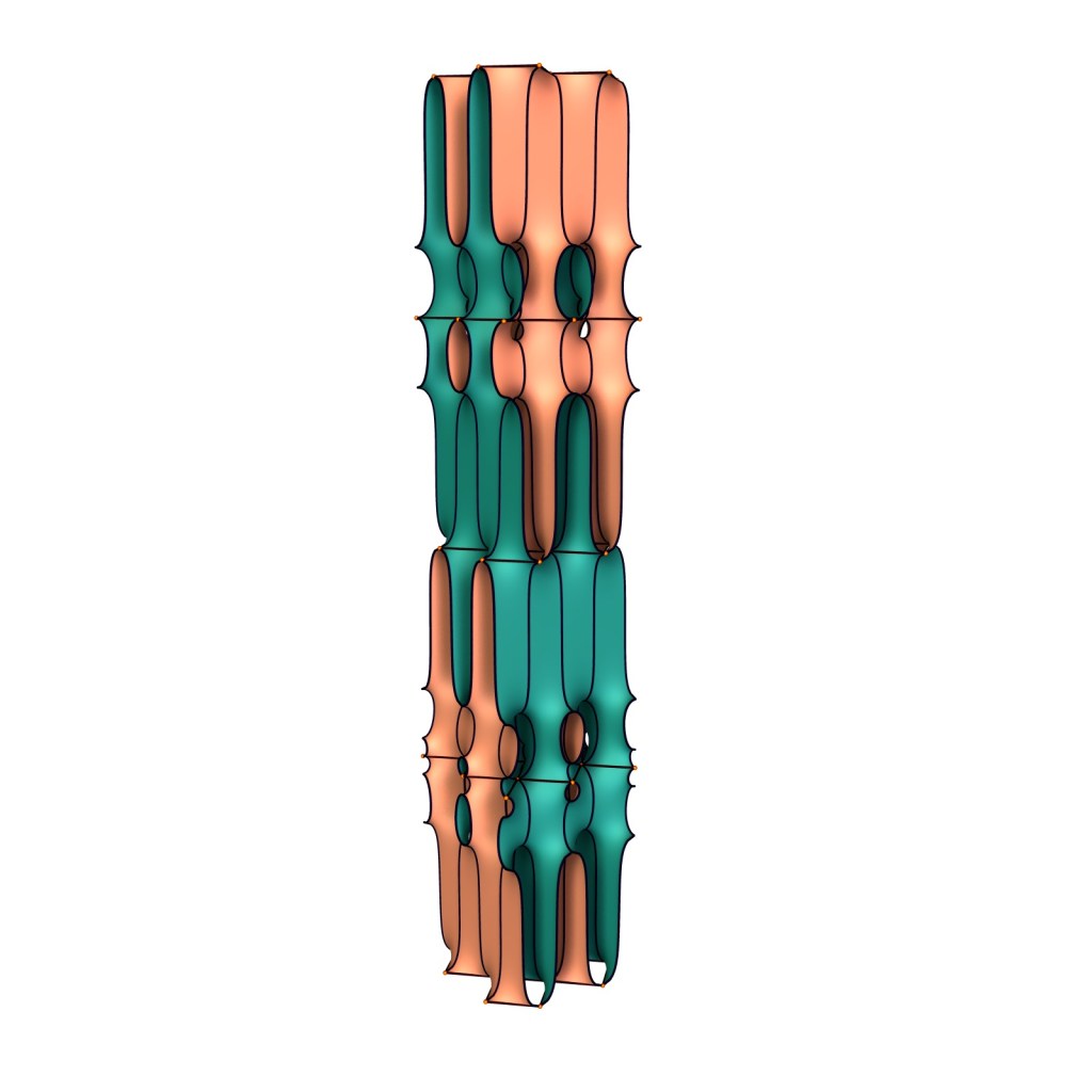The deformation family of this surface imperceptibly moves the small handle up and down. One of the limits is an exotic Karcher-Scherk surface whose existence has not been established. The divisor of the squared Gauss map is below.