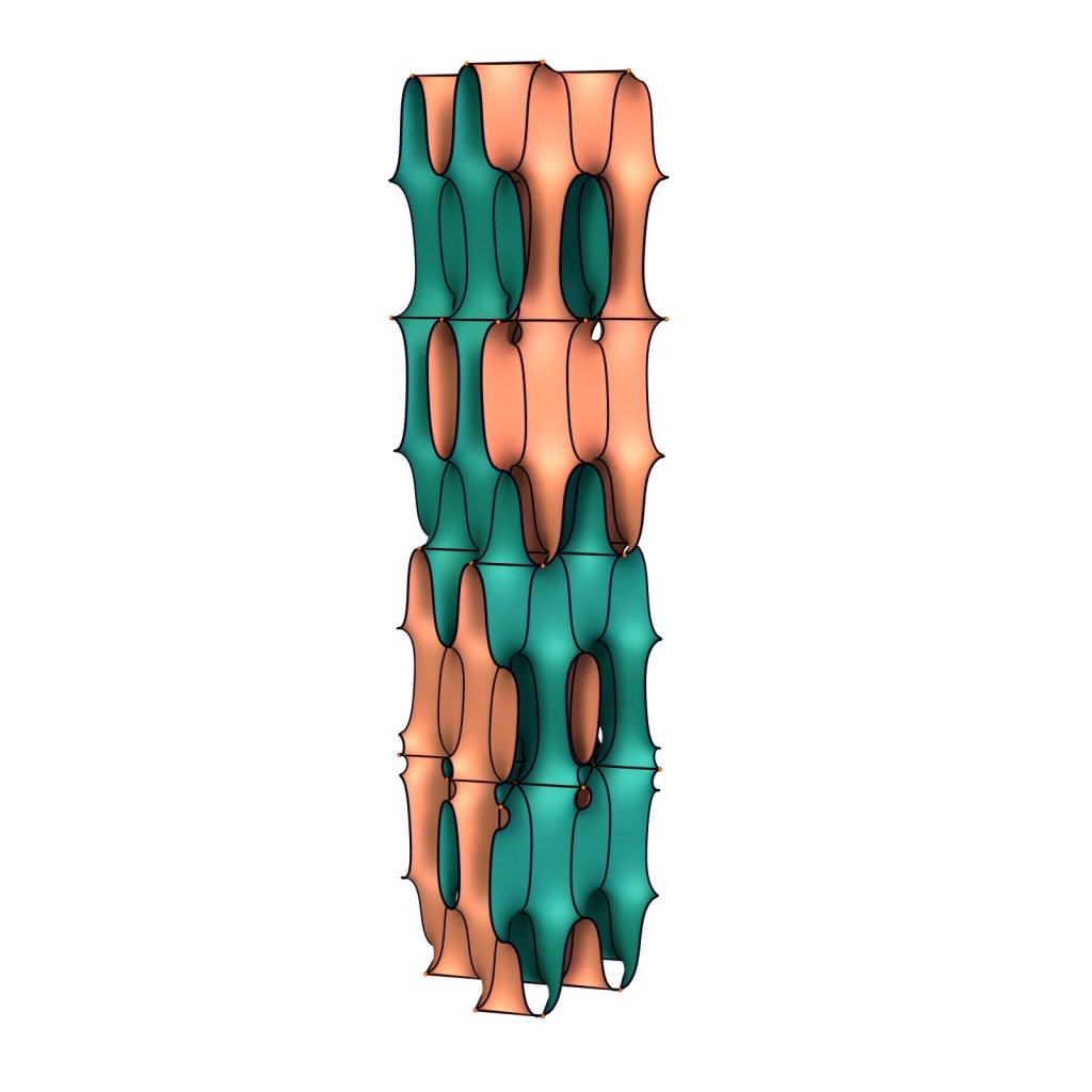 Below are 8 copies of a translational fundamental piece near the two limits: The left limit consists of the exotic/experimental Karcher-Scherk surface of genus 3 joined end-to-end with a genus 0 Scherk surface, the right uses two genus 0 and one genus 1 Karcher-Scherk surface.