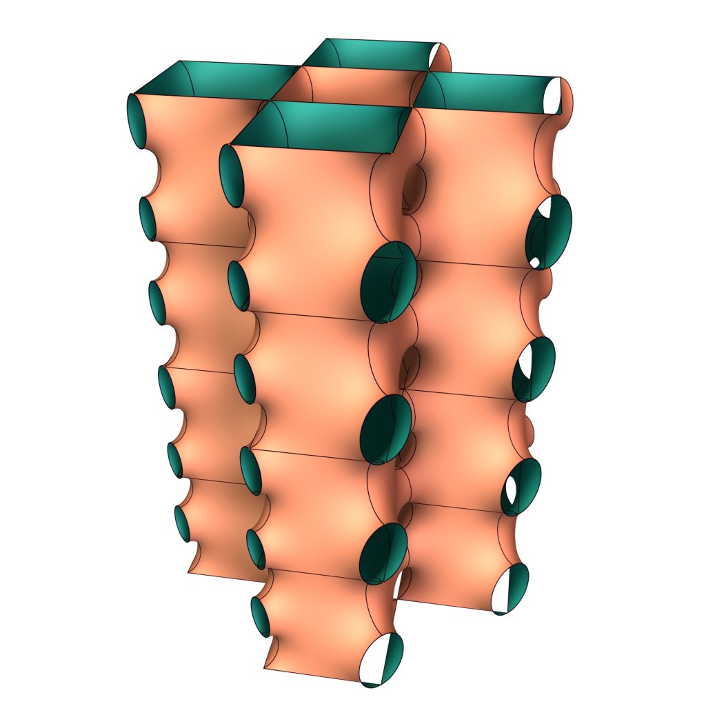 Below are 8 copies of a translational fundamental piece near the two limits: The left limit consists of an experimental genus 3 Karcher-Scherk surface, the right of singly periodic Scherk surfaces with different frequencies.