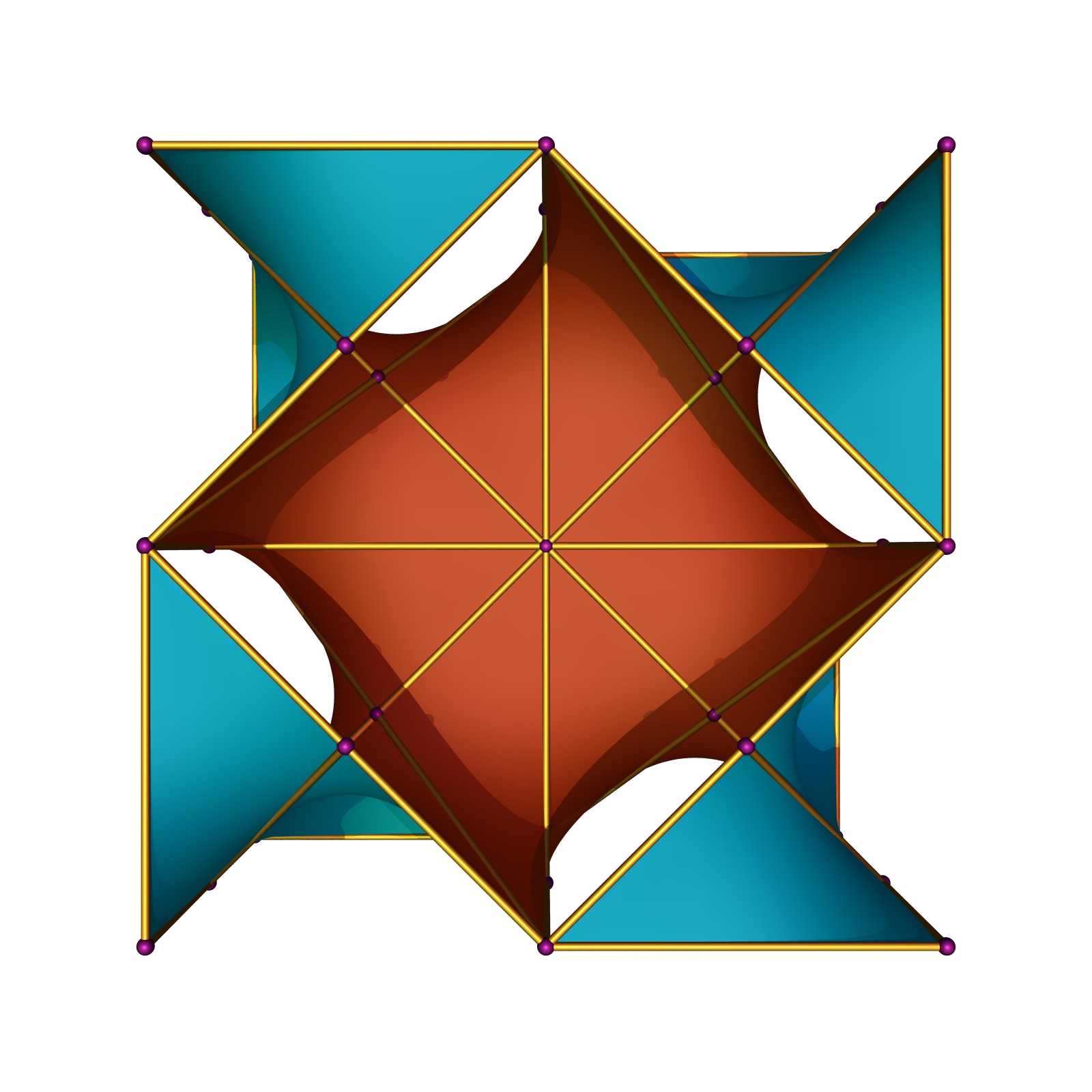 Extending the surface further produces the appealing triply periodic surface above. Below is a top view. This would make a nice design for a jungle gym. Unfortunately, this surface will not stay embedded; you see this at the corners where three pairwise orthogonal edges meet.