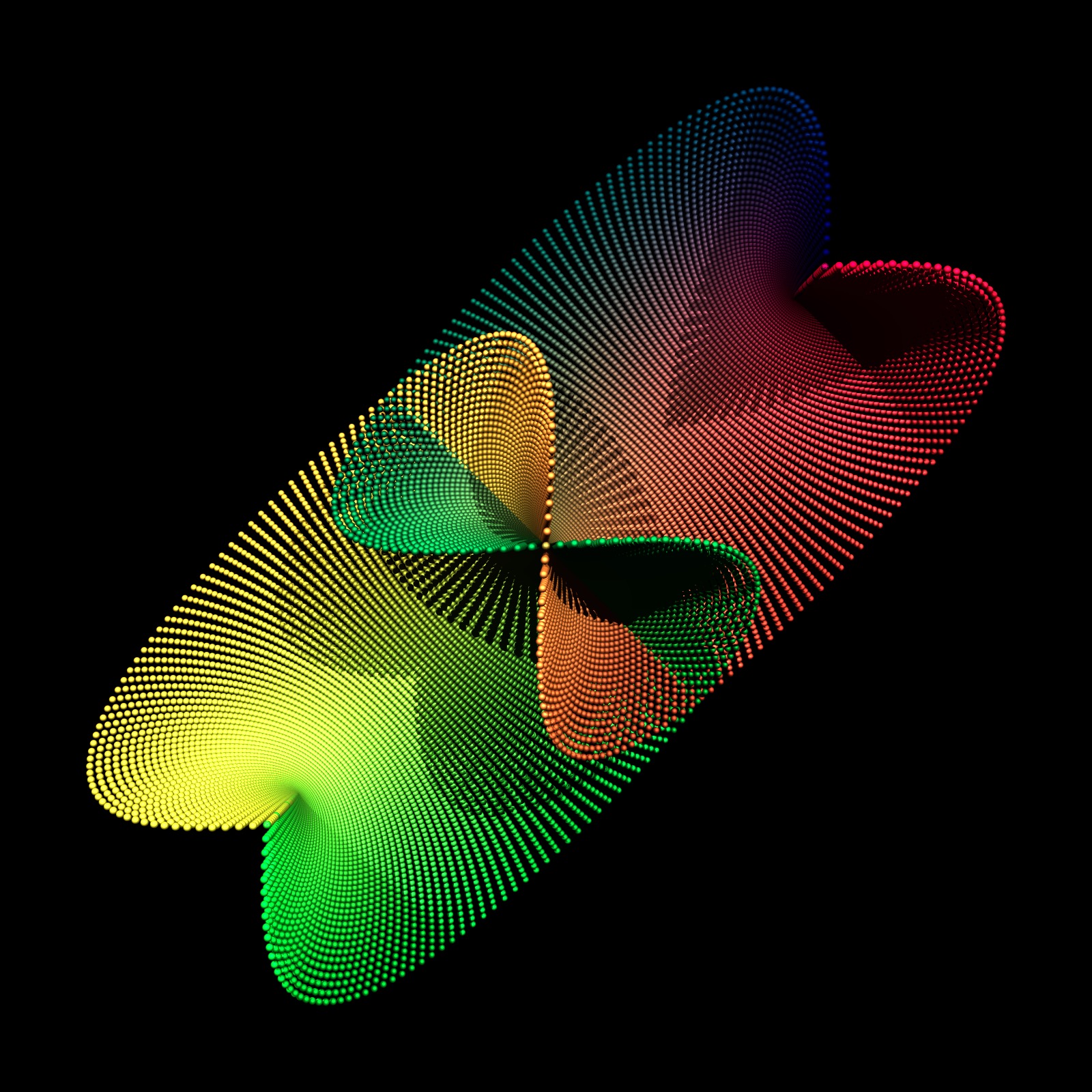 The macro make_sphere_carpet takes the previously defined ranges of the parameter values as arguments, and in addition parameters xd and yd that determine how many spheres will be placed. rad controls the size of the spheres. Here, they also increase with the radius xc for dramatic effect. For each grid point (xc,yc) a sphere is placed at the coordinates surf(xc,yc), with a color that is also determined by the coordinate.