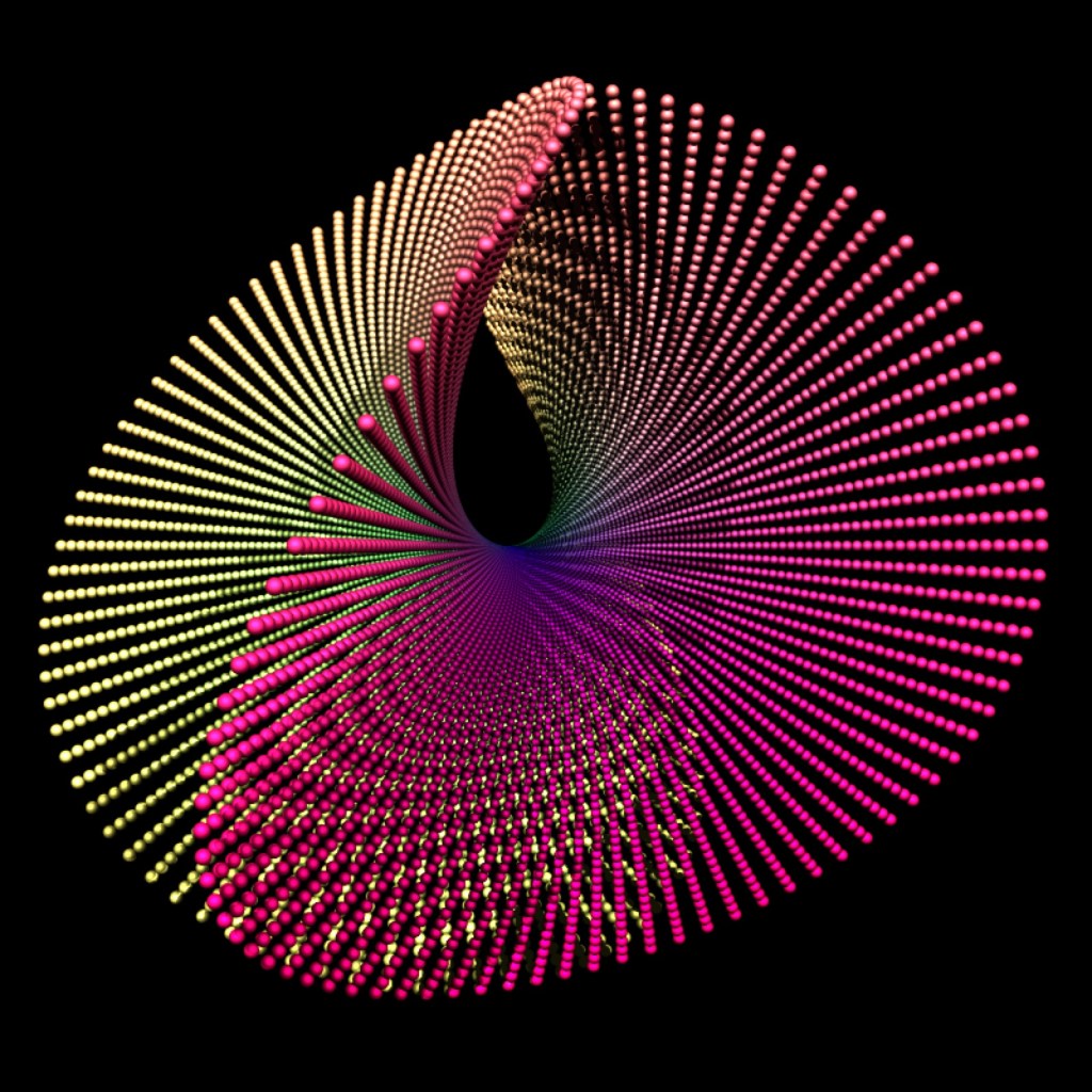 Today, the plan is to make something like the images above: Placing small colorful beads at the grid points of a parameter grid. The code for this is a simple loop: