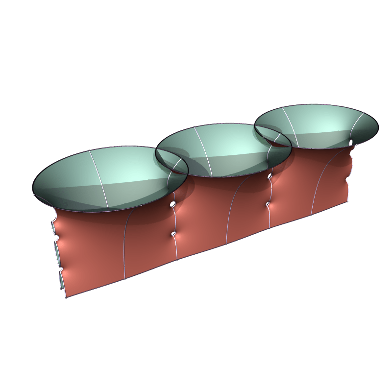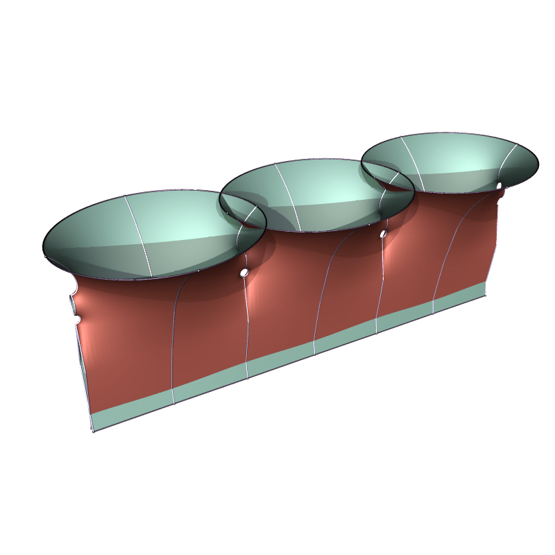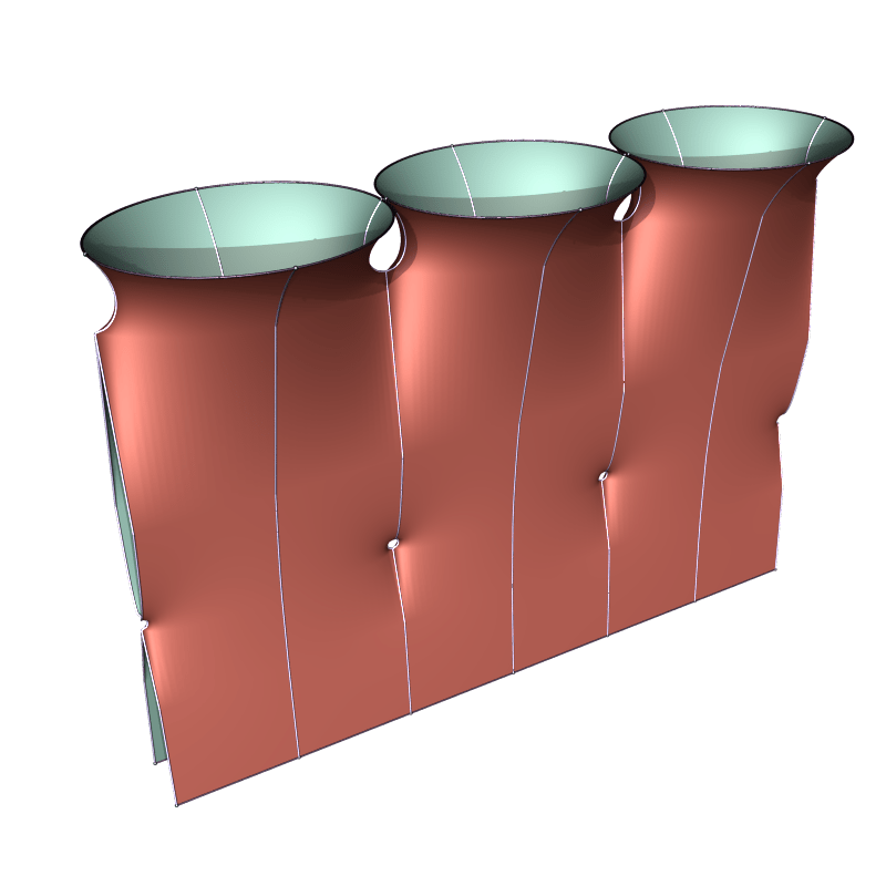 The same works for two (and likely many more handles). Below is the genus two surface with parallel annular ends. This one is likely the limit of k-Noids of genus 2k for k to ∞.