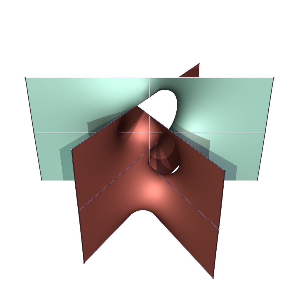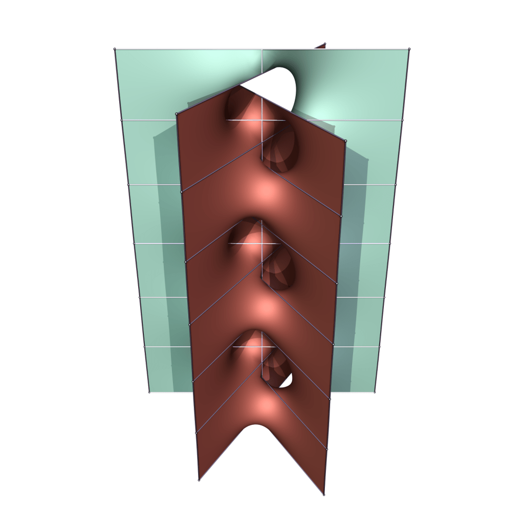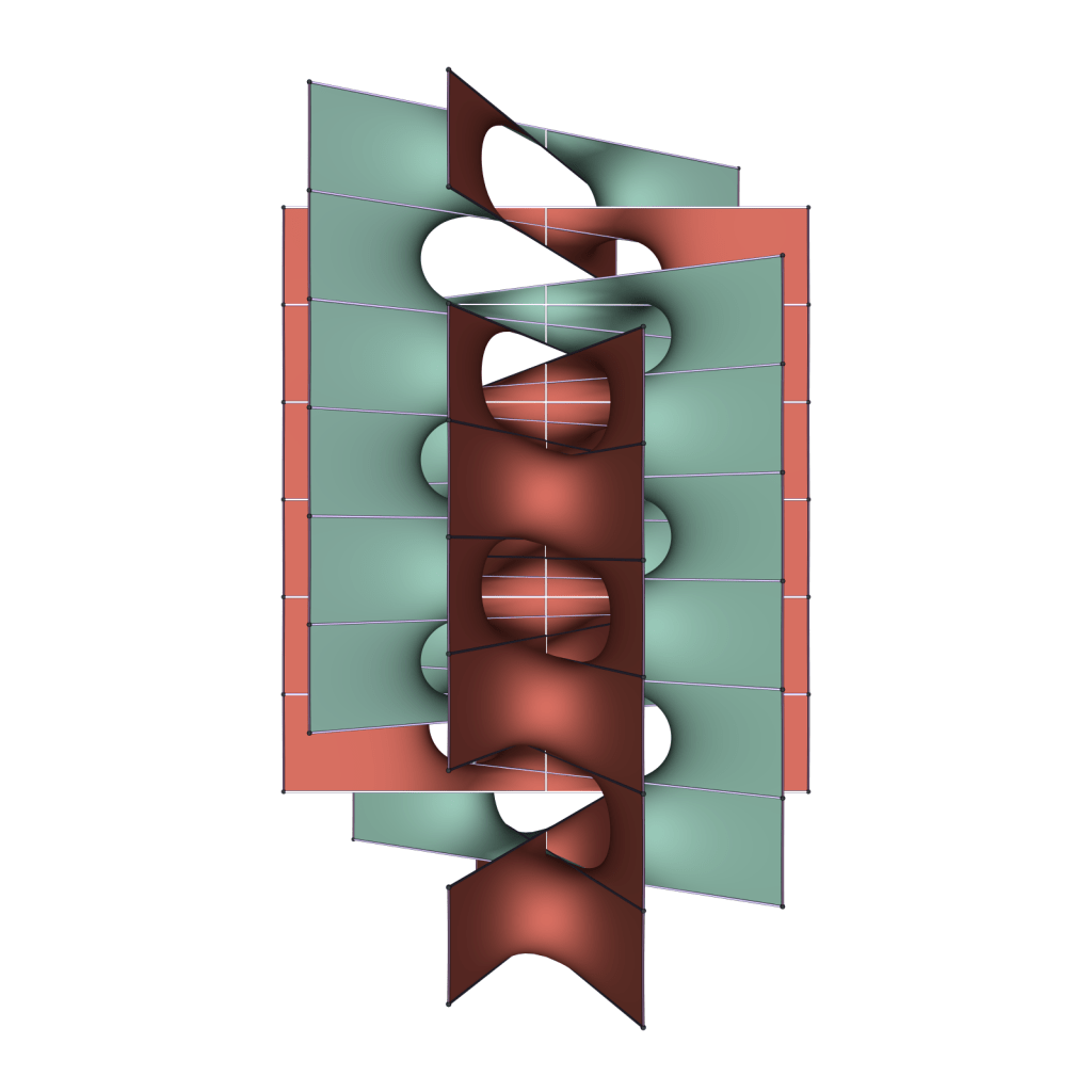 They can be obtained by taking limits of Plateau solutions to closed 8-gons in space as indicated above. The two vertical segments on the left become the central axes and the surface can be extended by rotations about it and about the horizontal straight lines: