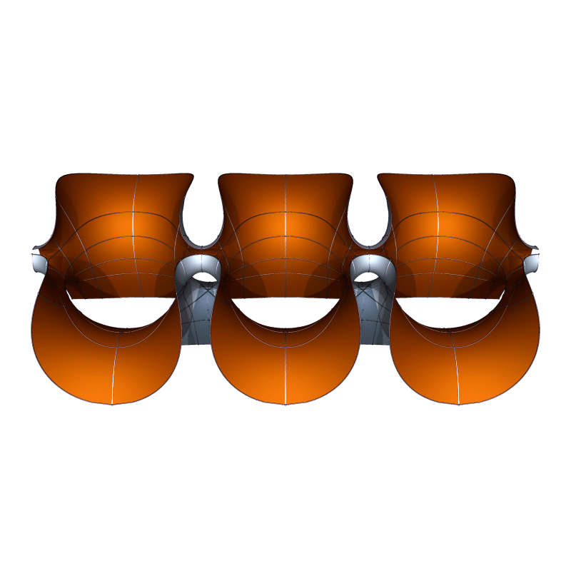 It arises as the dihedralization limit of the symmetrized torus with two Enneper ends. As such it comes in a 1-parameter family and an easy to solve period problem. Below are two views of a surface with a different parameter value.