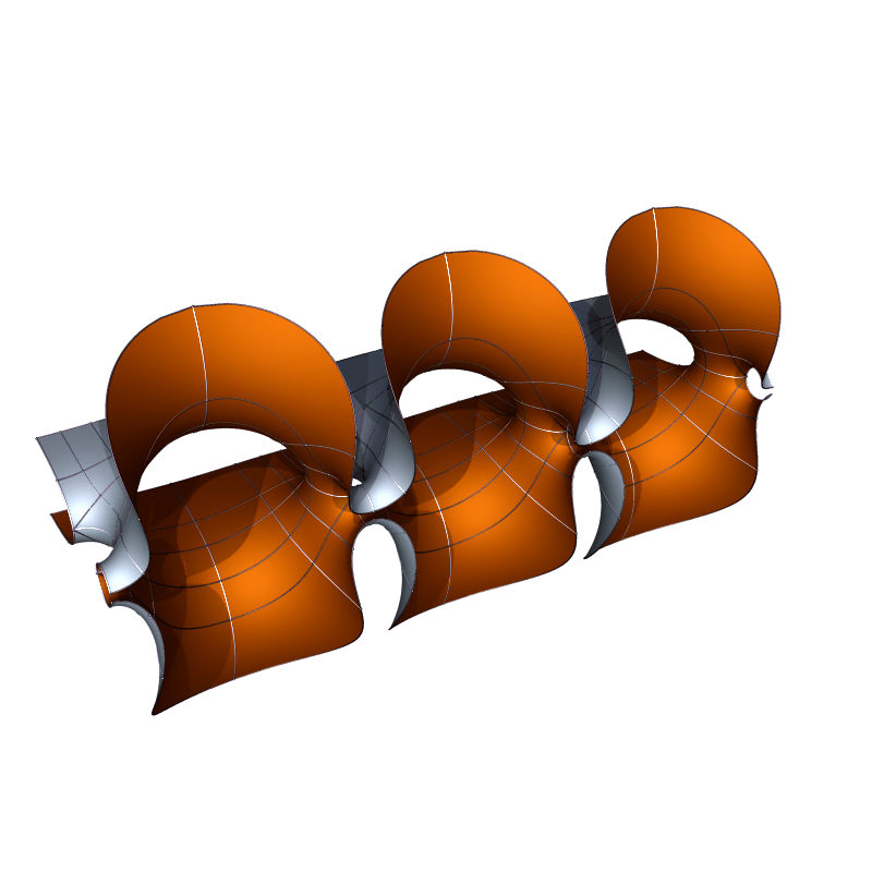 Above is a translation invariant surface with two parallel annular ends and two periodic Enneper ends (only the front one is visible). The quotient surface has genus 1.